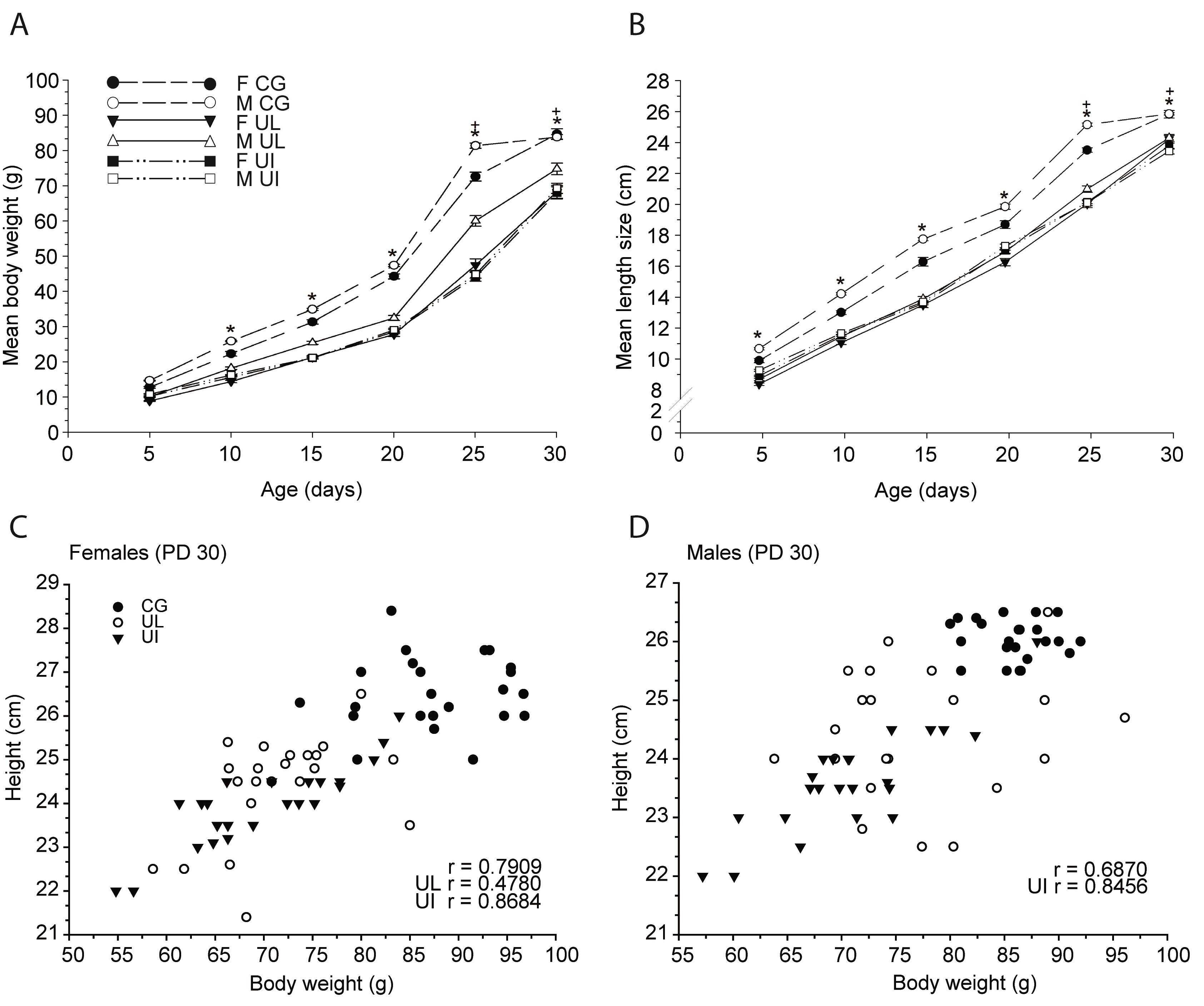 Figure 3. Mean (± SEM) of body weight in CG, UL and UI female and male pups on PDs 5 to 30. B) Mean length size. * p<0.001 CG vs. UL or CG vs. UI; + p<0.05 M UL vs. M UI. C) Correlations between body weight and height in CG, UL and UI female pups on PD 30 and D) in male pups. The r values for each experimental group and for the total are indicated, p<0.001. (n= 23 rats per condition).