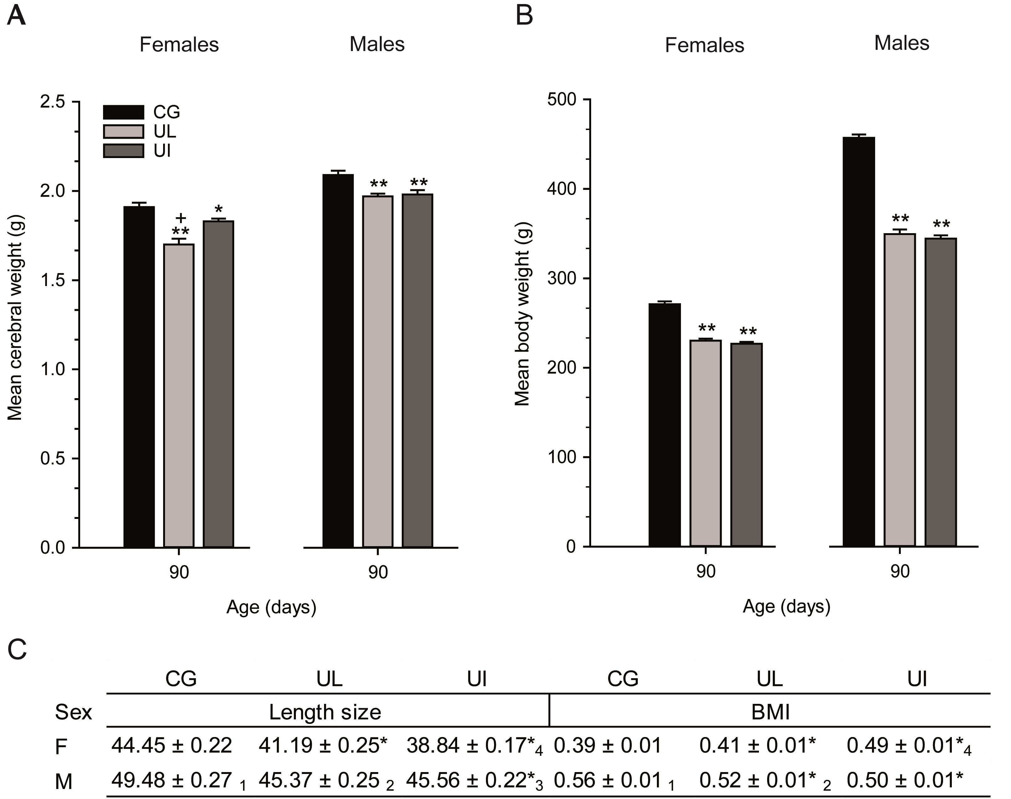 Figure 4. A) Mean (± SEM) cerebral weight on PD 90 in CG, UL and UI female and male rats (n=10 per condition). B) Mean body weight (n=23 per condition), * p<0.05 CG vs. UL or CG vs. UI; ** p<0.001 CG vs. UL or CG vs. UI; + p<0.001 F UL vs. F UI or M UL vs. M UI. C) Mean size and BMI (n=23 per condition), * p<0.001 CG vs. UL or CG vs. UI; (1) F CG vs. M CG; (2) F UL vs. M UL; (3) F UI vs. M UI; (4) F UL vs. F UI.