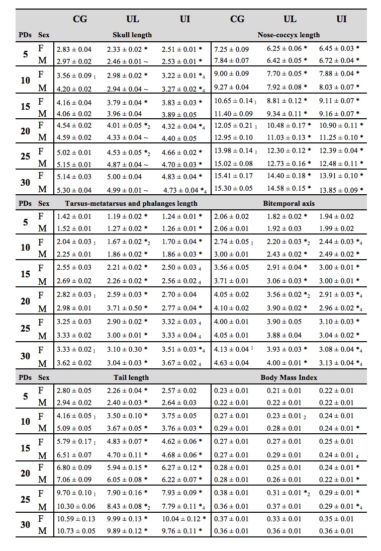 Table 1. Mean (± SEM) of body lengths (cm) in CG, UG, and UI female and male pups on PDs 5-30. (n= 23 per condition). * p <0.001 CG vs. UL or CG vs. UI; ~ p <0.01 CG vs. UL or CG vs. UI; (1) p <0.01 F CG vs. M CG;(2) p < 0.01 F UL vs. M UL; (3) p < 0.01 F UI vs. M UI not shown; (4) p < 0.01 UL vs. UI.