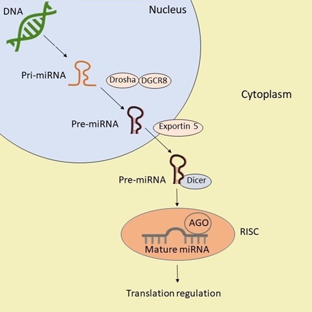 Figure 1. Scheme of miRNAs Biogenesis and function. After being transcribed in the nucleus, the pri-miRNA is processed by Drosha/DGCR8 into pre-miRNA which is transported to the cytoplasm by exportin 5, where is processed by Dicer, generating mature miRNA, it is this mature miRNA that exerts its function of translation regulation.