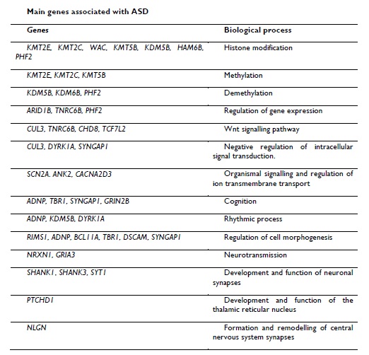 Research has been done to try to understand the genetic mechanism by which ASD is generated, however, the main obstacle is that ASD manifests a spectrum of symptoms that are caused by multiple genes, and has been shown to be largely caused as a result of alterations in genes that are involved in brain development.8 Although several genes have been identified as ASD genes, including NRXN1, SHANK1, SHANK3 and PTCHD1, much remains to be known about the extent of the underlying mutations.12 Table 1 shows the main genes associated with ASD.13 The genetic contribution to ASD is therefore heterogeneous, with many loci involved in the development of the disorder at different levels in different individuals,14 which is the reason why the phenotypic expression of these genes is highly variable in each person. Currently, it has not been possible to identify a common locus related to susceptibility to ASD. In addition to this, epigenetic mechanisms have recently been related as potential contributors to the development of ASD, that is to say, environmental factors have an important role in the predisposition to develop these disorders.15