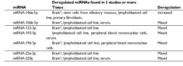 In addition to the above, have been reported altered expressions of miRNAs in whole blood, serum, lymphoblastic lines and post-mortem brains of individuals with ASD, compared to healthy individuals.8 156 altered miRNAs have been reported in patients with ASD, of which 7 were found in at least 3 different studies (table 2).17