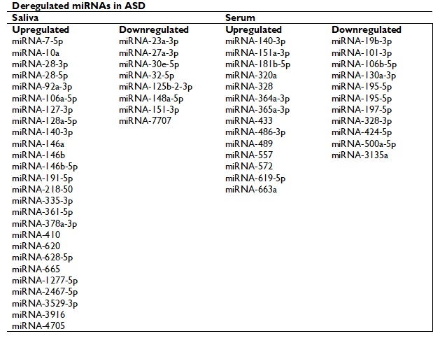 Table 3. miRNAs that have been described as dysregulated in the serum and saliva of individuals with ASD.