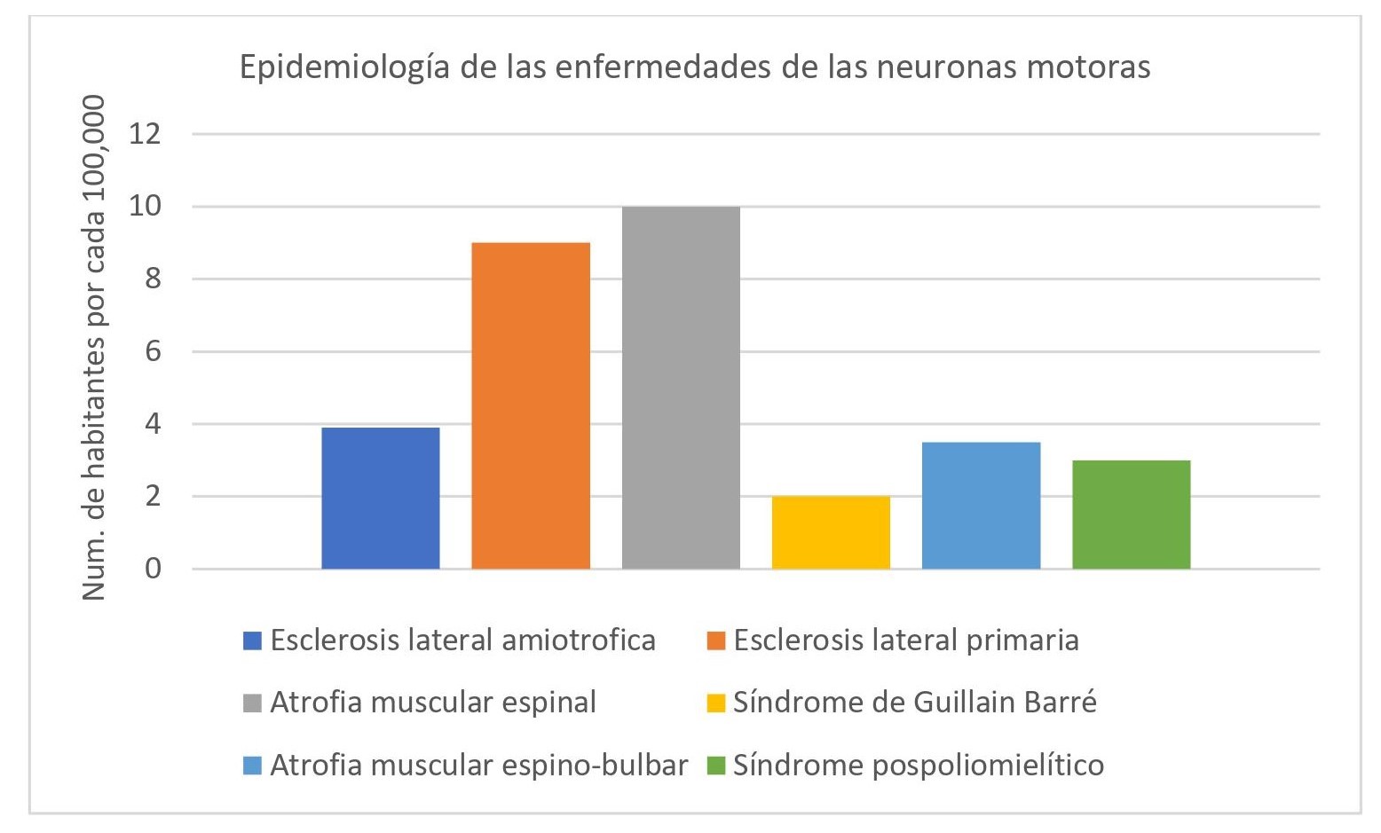 Así, las enfermedades de las neuronas motoras representan un grupo heterogéneo de trastornos neurodegenerativos letales cuyas causas aún se desconocen en gran medida. Se calcula que en México hay 6,000 casos de esclerosis lateral amiotrófica (ELA) diagnosticados.9 Las enfermedades motoras producen atrofia progresiva de los músculos debido a la degeneración de neuronas piramidales en la corteza motora, neuronas del tallo cerebral y neuronas del asta anterior en la médula espinal.10