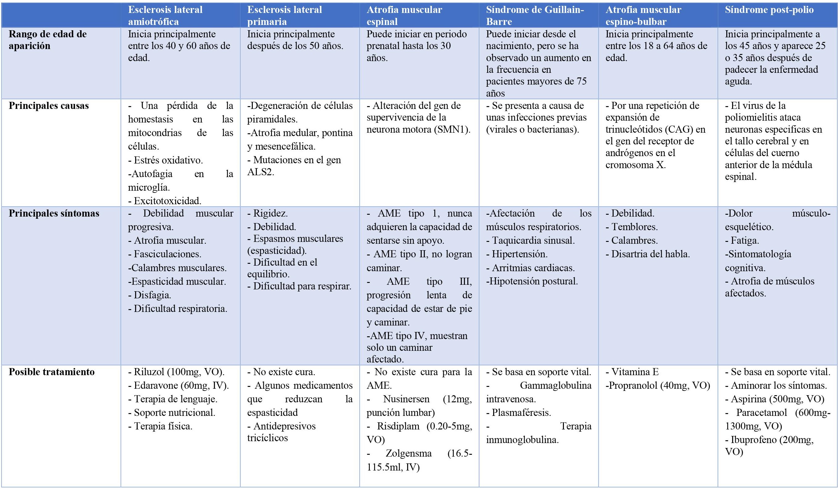 En el Sistema Nervioso Central existen diferentes tipos de neuronas. Una de ellas son las células motoras o motoneuronas. Estas células son de gran importancia ya que llevan la información a los músculos del cuerpo. Debido a la degeneración de neuronas motoras piramidales en la corteza motora, neuronas del tallo cerebral y neuronas del asta anterior en la médula espinal inducen la aparición de enfermedades motoras que producen atrofia progresiva de los músculos. Así, cuando se dañan estas células nerviosas, se presentan diferentes enfermedades motoras “raras” como: la esclerosis lateral amiotrófica, la esclerosis lateral primaria, la atrofia muscular espinal, síndrome de Guillain-Barré, la atrofia muscular espinal-bulbar y el síndrome pospoliomielítico, entre otros. Las patologías motoras pueden tener un origen congénito, genético o ambiental (viral, por fármacos o esporádico). Aunque estas enfermedades motoras se consideran poco comunes, son de gran importancia ya que los pacientes no logran recuperarse por la progresión de la enfermedad, lo que conlleva al fallecimiento. Esta revisión, analiza una serie de estudios clínicos de los últimos 20 años en estas patologías motoras para comprender mejor su etiología, diagnóstico y tratamientos, como el uso de células madre en la producción de oligodendrocitos que producen mielina, el cual es un factor clave en las enfermedades motoras y la utilización de antioxidantes que pueden ser la clave para obtener resultados prometedores que tiene como objetivo mantener la esperanza de vida en los sujetos que las padecen.