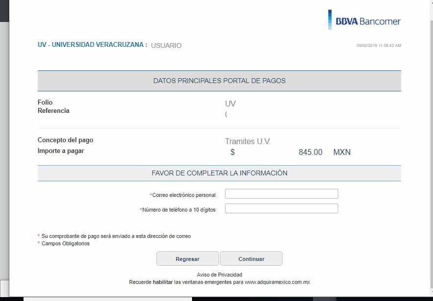 Al dar clic en la opción de pago con tarjeta de crédito aparecerán en la pantalla los datos de referencia, así como el concepto de pago.