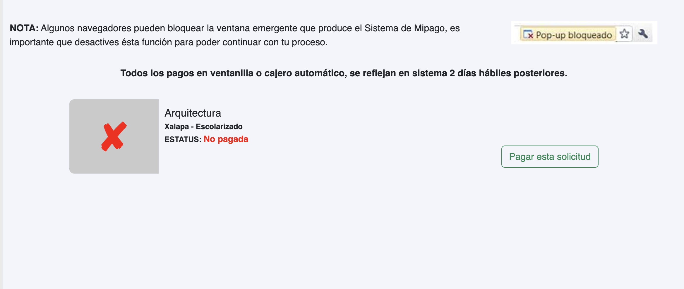 Nota: Algunos navegadores pueden bloquear la ventana emergente que produce el Sistema de Mipago, es importante que desactives está función para poder continuar con tu proceso.