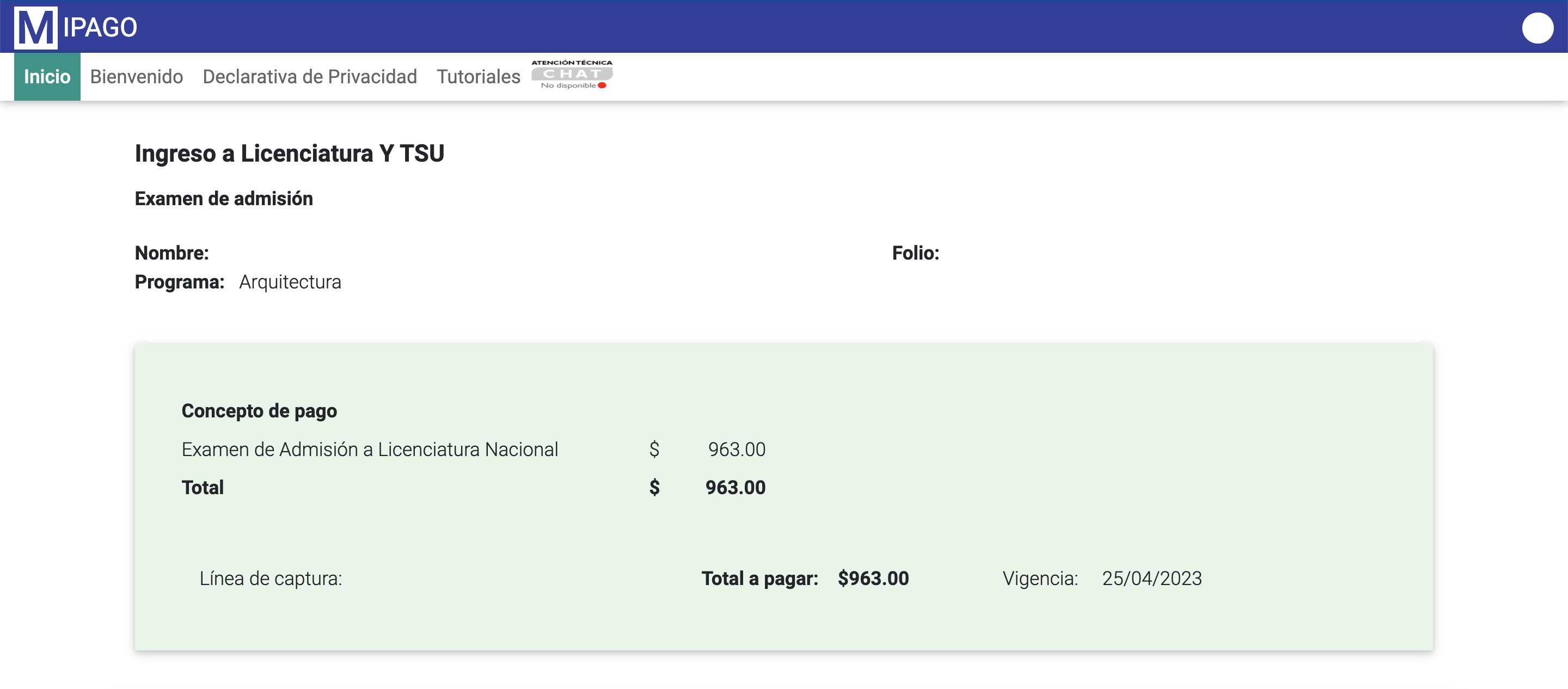 Al dar clic en la opción de pago con tarjeta de crédito aparecerán en la pantalla los datos de referencia, así como el concepto de pago.