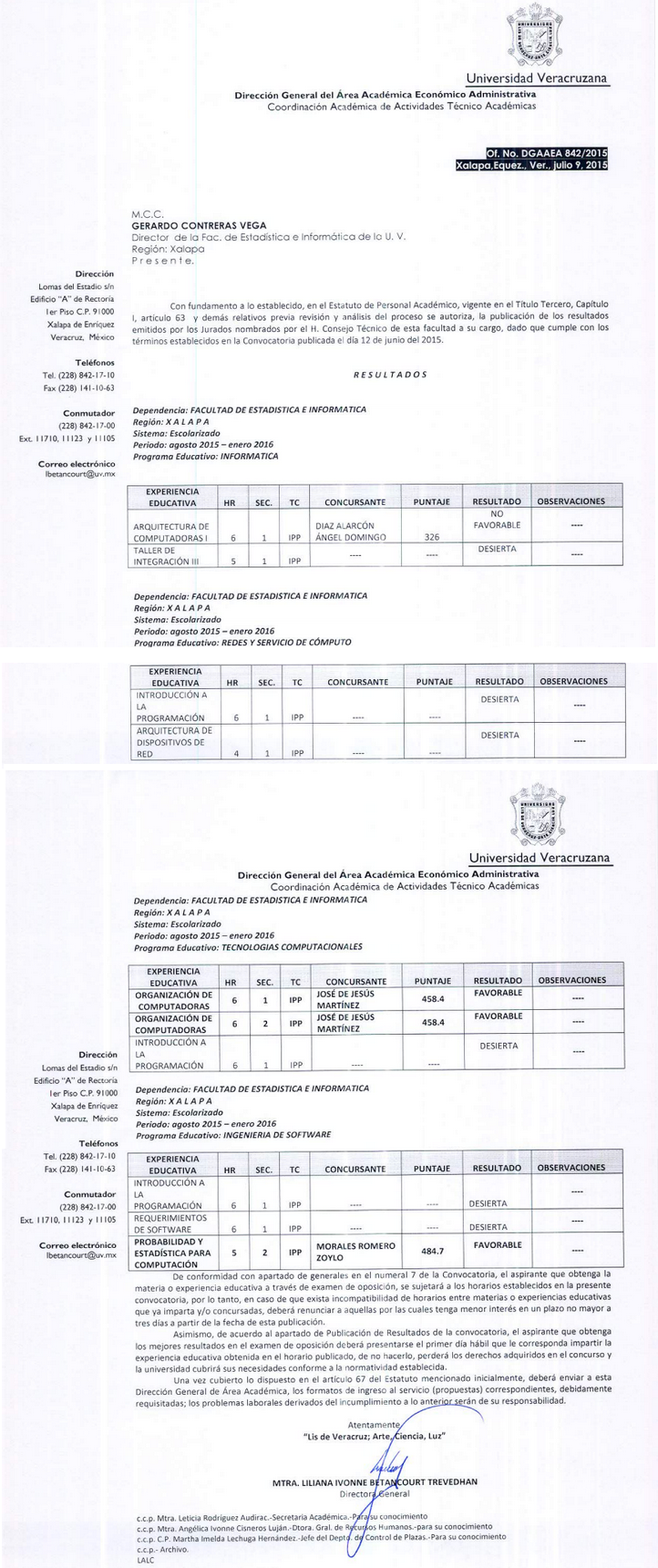 Resultados de convocatorias para docente por asignatura (7 de agosto 2015)