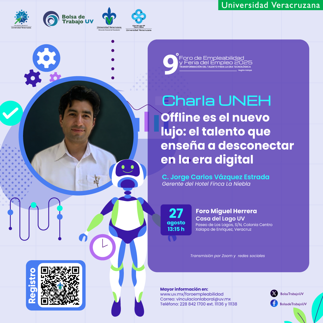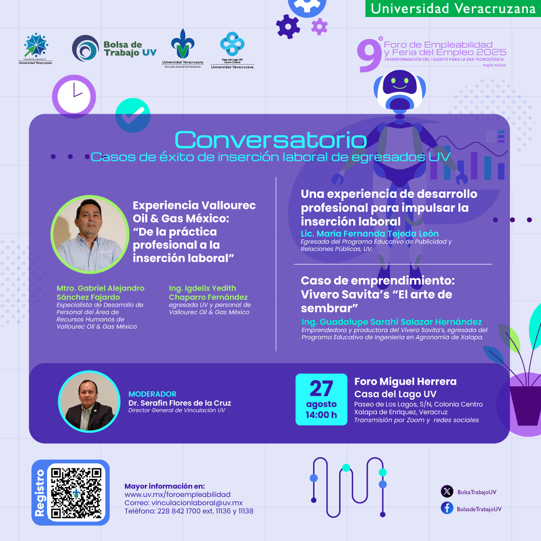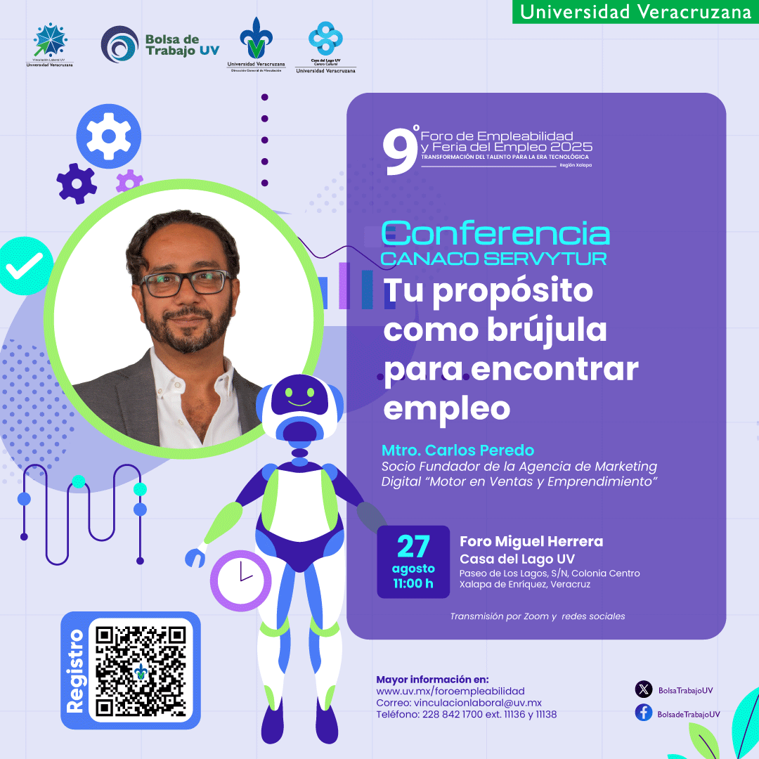 Estimado Universitario o público externo participante, este Foro es un evento gratuito que hemos preparado en vinculación con organizaciones de apoyo al empleo y empresas comprometidas con la formación de estudiantes y el desarrollo del capital humano profesionista para que sea pertinente a las necesidades de la sociedad y del mercado de trabajo. Por ello, durante el Foro, expertos estarán compartiendo sus conocimientos, experiencias, consejos y herramientas para capacitarte, dar valor agregado y enriquecer tu perfil profesional para incrementar tu nivel de empleabilidad, contribuir a tu inserción laboral oportuna, a mantenerte vigente y actualizado y a que logres un desempeño profesional competitivo y exitoso ante los cambios y transformaciones del mundo del trabajo. Ante los retos del mercado de trabajo, hay exigencias emergentes para los profesionistas, por esta razón nos estaremos enfocando en darte contenido para tu incrementar tu empleabilidad, crecimiento profesional y competitividad laboral a través de las siguientes actividades: Panel con empleadores, conferencias y charlas empresariales de empleabilidad y reclutamiento.