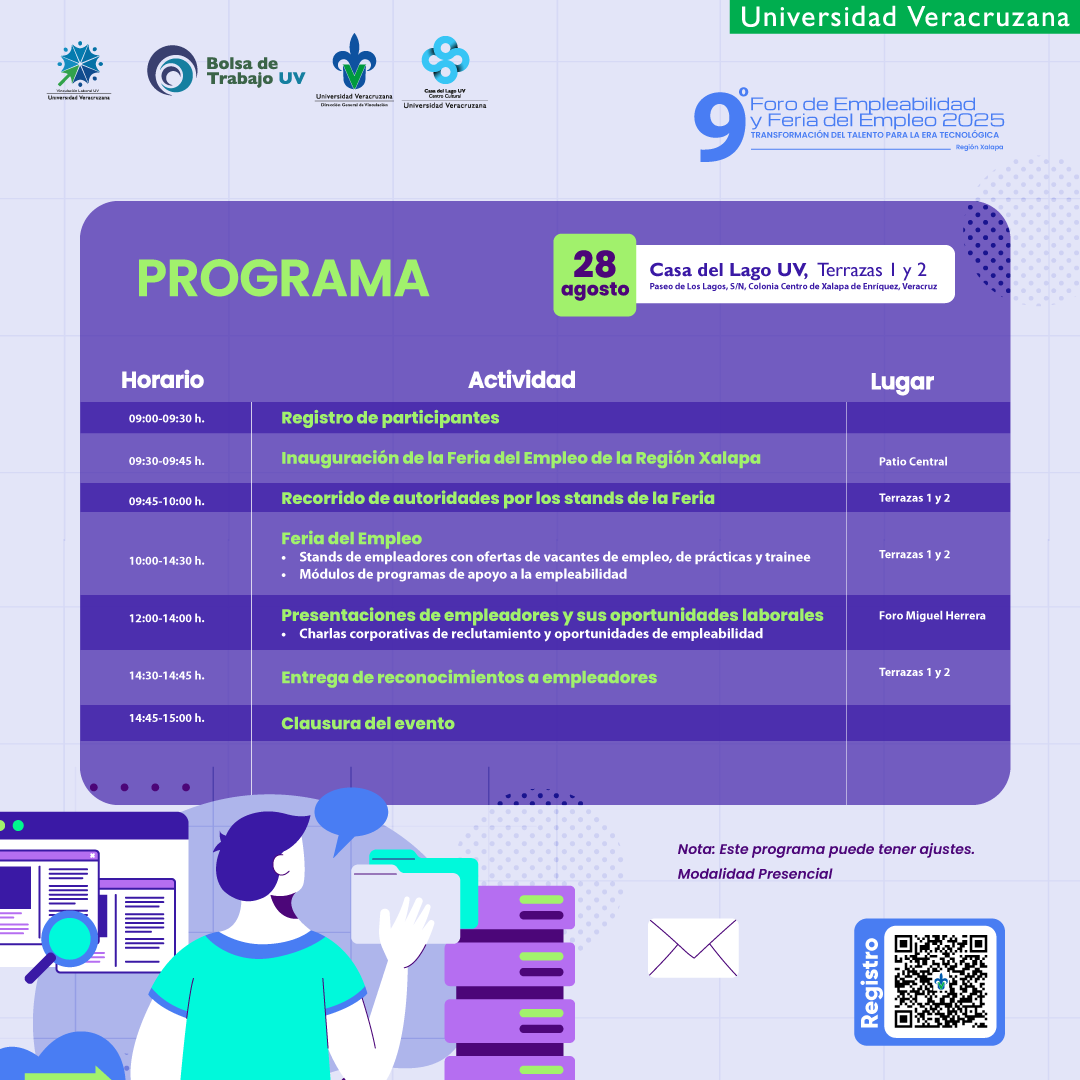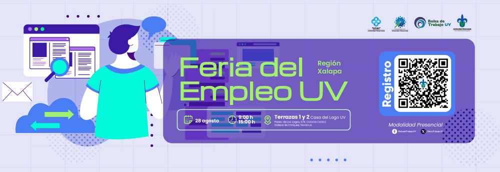 La Feria del Empleo UV de la Región xALAPA se llevará a cabo de manera presencial el día 28 de agosto de 2025, de 09:00 a 15:00 hrs., en las Terrazas 1 y 2 de la Casa del Lago UV, ubicada en Paseo de Los Lagos, S/N, colonia Centro de Xalapa de Enríquez, Veracruz, tiene la finalidad de ser un espacio estratégico para la vinculación laboral directa y ágil de universitarios y profesionistas en búsqueda de empleo o de espacios de formación práctica con organizaciones y empresas empleadoras de los sectores industrial, comercial y de servicios, en búsqueda de talento humano profesional para sus puestos vacantes de empleo formal o programas de prácticas, servicio social o semilleros de capital humano. La Feria se conformará por un pabellón de stands de empleadores en los que ofrecerán sus oportunidades de empleo de nivel técnico y profesional para diferentes perfiles.