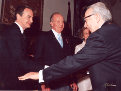 ![]() El Presidente de España, José Luis Rodríguez Zapatero, felicita al galardonado. (Foto: Archivo Sergio Pitol) |