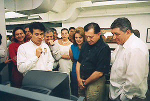 Coatzacoalcos, Ver.- En el centro de autoacceso para el aprendizaje de idiomas, el gobernador Miguel Alemán, el rector Víctor Arredondo y el titular de la SEC, Juan Maldonado, observaron una demostración de los innovadores métodos de autoaprendizaje. (Foto: Luis Fernando Fernández)