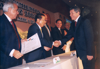 Por haber colocado a la UV en el escenario de las mejores instituciones de educación superior pública, el rector Víctor A. Arredondo recibió el reconocimiento “Liderazgo Veracruz 2003”, otorgado por las organizaciones empresariales y profesionales de Veracruz. (Foto: Luis Fernando Fernández)