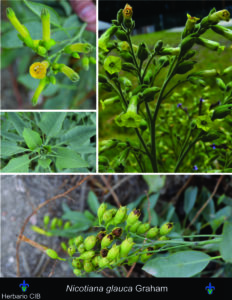 Las inflorescencias son paniculadas con flores vistosas de color amarillo; la corola llega a medir hasta 5 cm de largo de color amarillo con los ápices y las bases de color verde. Los frutos son cápsulas con forma elipsoidal de color verde que poseen numerosas semillas comprimidas lateralmente de color café.