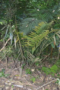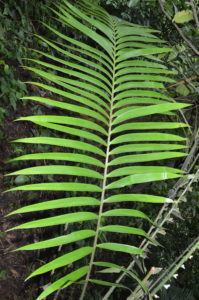 Esta especie se caracteriza por presentar tallos aéreos de hasta 1.5 de alto. Las hojas son ascendentes hasta de 2.8 m de largo y cuando emergen son de color café-amarillentas, el pecíolo esta armado de aguijones. Los folíolos son oblongos a lanceolados, falcados en la parte distal, papiráceos, con el ápice acuminado y simétrico; cada hoja tiene entre 7-40 pares de folíolos; los folíolos medios llegan a medir hasta 45 cm de largo y 5 cm de ancho.