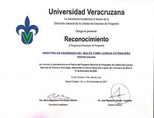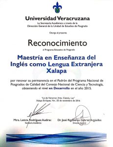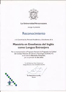 - Reconocimiento PNPC 2015, Maestría en Enseñanza del Inglés como Lengua Extranjera (MEILE).