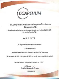 - Acreditación COAPEHUM 2010 de la Licenciatura en Lengua Francesa.