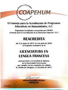 - Reacreditación COAPEHUM 2017 de la Licenciatura en Lengua Francesa.