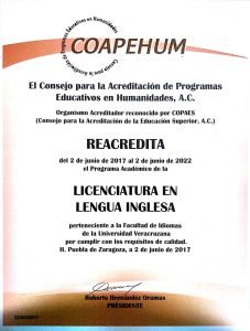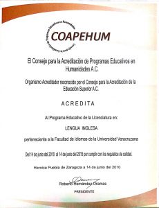 - Acreditación COAPEHUM 2015 de la Licenciatura en Lengua Inglesa.