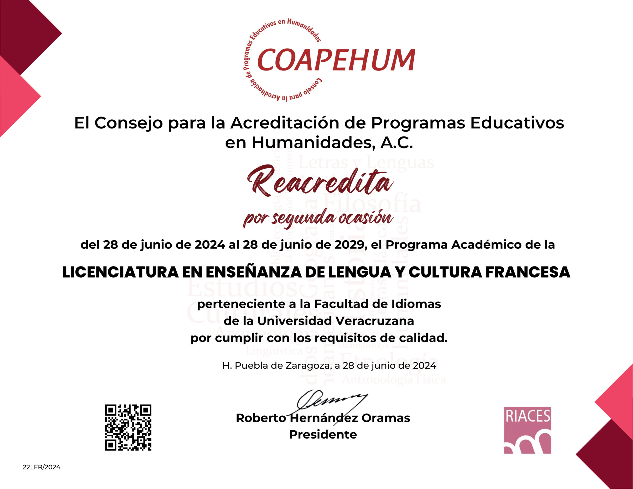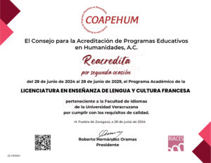 - Reacreditación COAPEHUM 2024 de la Licenciatura en Enseñanza de Lengua y Cultura Francesas.