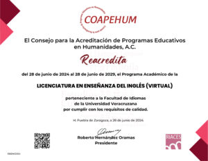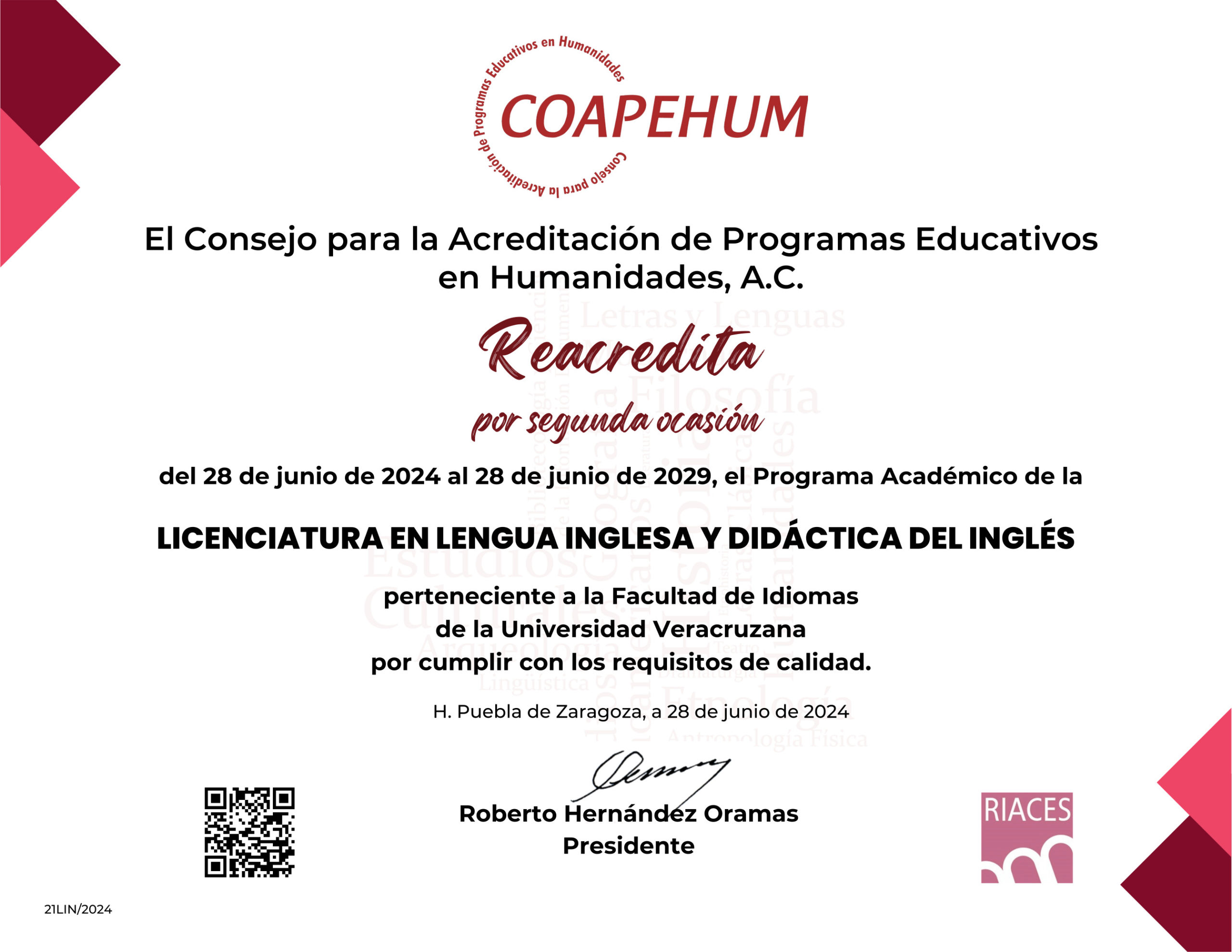- Reacreditación COAPEHUM 2024 de la Licenciatura en Lengua Inglesa y Didáctica del Inglés.