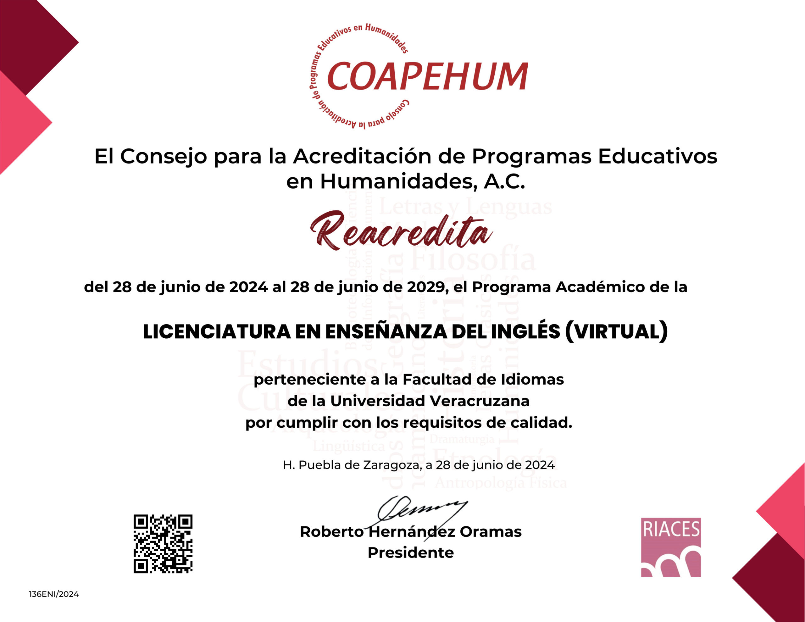 - Reacreditación COAPEHUM 2024 de la Licenciatura en Enseñanza del Inglés.