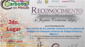 En el marco del XV Simposio Internacional del Carbono en México, celebrado virtualmente en Puerto Ángel, Oaxaca, del 16 al 18 de octubre, organizado por el Programa Mexicano del Carbono (PMC), la Universidad del Mar, la Universidad Autónoma de Baja California, The Ocean Foundation y Stanford University, Jazmín Contreras López, estudiante de Maestría en Biología Integrativa, obtuvo el 2° lugar en el Concurso de Ponencias Orales con su trabajo titulado “Aportación de los árboles exóticos en la captura de carbono en bosques urbanos de Xalapa, Veracruz, México”. En su ponencia, presentó resultados de su tesis “Servicios ambientales de los bosques urbanos de la región de Xalapa, Veracruz”, dirigida por el Dr. César I. Carvajal-Hernández, con la codirección de la Dra. Tania Romo González de la Parra, y asesoría de las Dras. Samaria Armenta Montero y Berenice Jarquin Pacheco. El estudio revela que, aunque la representación de los árboles exóticos en los bosques urbanos de Xalapa es baja, su contribución al almacenamiento de carbono es significativa, sumándose al conjunto de servicios ecosistémicos que estos bosques brindan.
