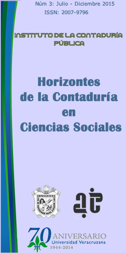 Horizontes de la Contaduría en las Ciencias Sociales. Año 2, Número 3, Julio-Diciembre 2015. Revista semestral electrónica editada por la Universidad Veracruzana a través del Instituto de la Contaduría Pública. Lomas del Estadio S/N, Zona Universitaria, C.P. 91000, Xalapa, Veracruz, México. Teléfono +52 (228) 8 41 89 00 extensión 13922. https://www.uv.mx/icp. Editora responsable: María del Carmen García García. Reserva de Derechos al uso exclusivo del Título: 04-2014-062611143100-203. ISSN: 2007-9796, ambos otorgados por el Instituto Nacional del Derecho de Autor. Difusión y soporte digital vía internet a cargo del Instituto de la Contaduría Pública. Responsable de actualización web: Mtro. José Luis Pintos. Avenida Luis Castelazo Ayala S/N Fracc. Industrial Ánimas, C.P. 91190, Xalapa, Ver.