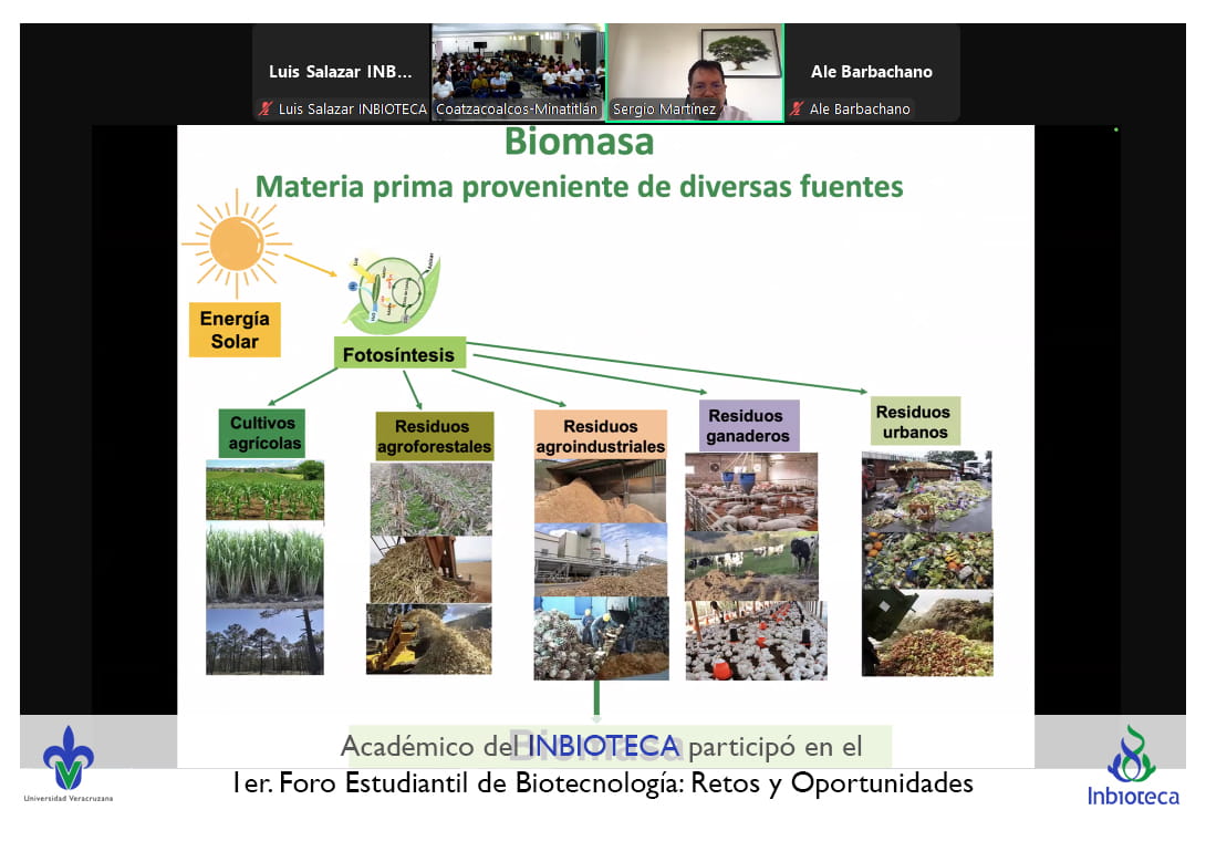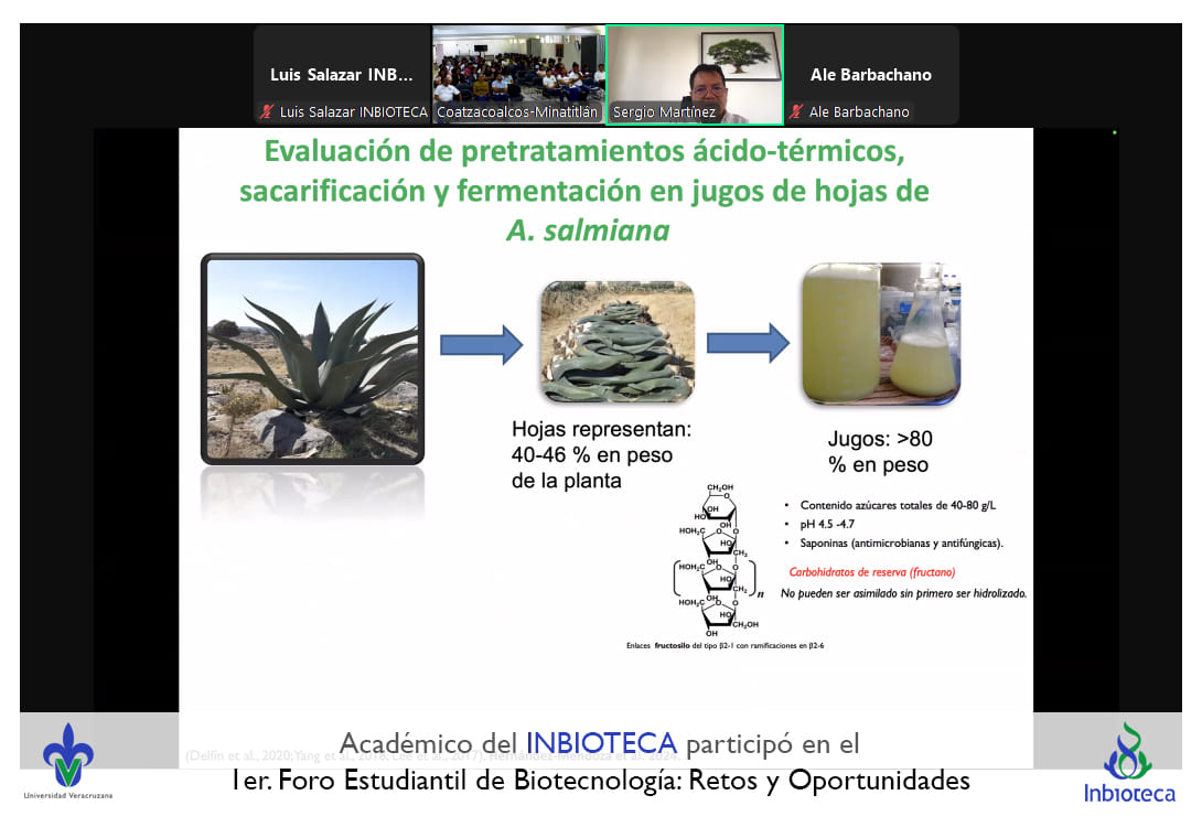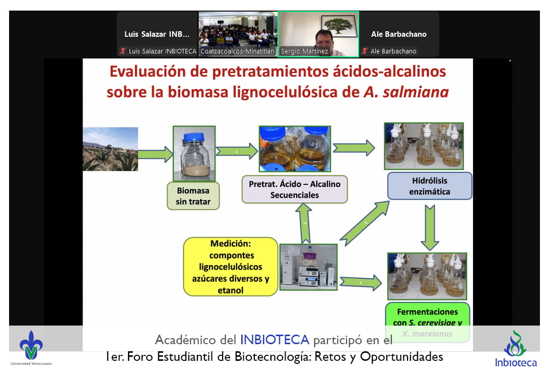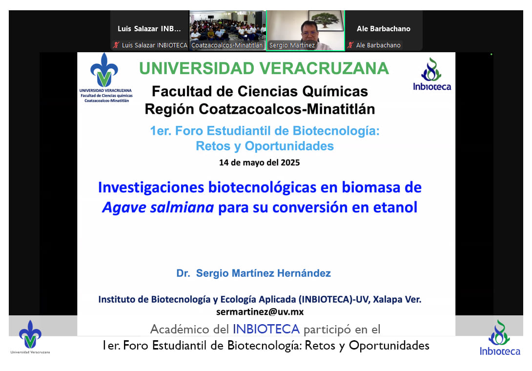 El Dr. Martínez-Hernández participó con la Ponencia titulada: "Investigaciones biotecnológicas en biomasa de Agave salmiana para su conversión en etanol" donde se presentaron resultados sobre el efecto de tratamientos fisicoquímicos sobre la lignocelulosa de agaves, la hidrólisis de la hemicelulosa y la celulosa y su fermentación en etanol. Cabe mencionar que el Dr. Martínez-Hernández pertenece al SNII en el Nivel 2, cuenta con perfil deseable PRODEP y es coordinador del Cuerpo Académico: Ecología y Manejo de la Biodiversidad (UV-CA-173) y trabaja en la Linea de Generación y Aplicación del Conocimiento (LGAC) Biotecnología Ambiental y Ecología Microbiana del INBIOTECA.