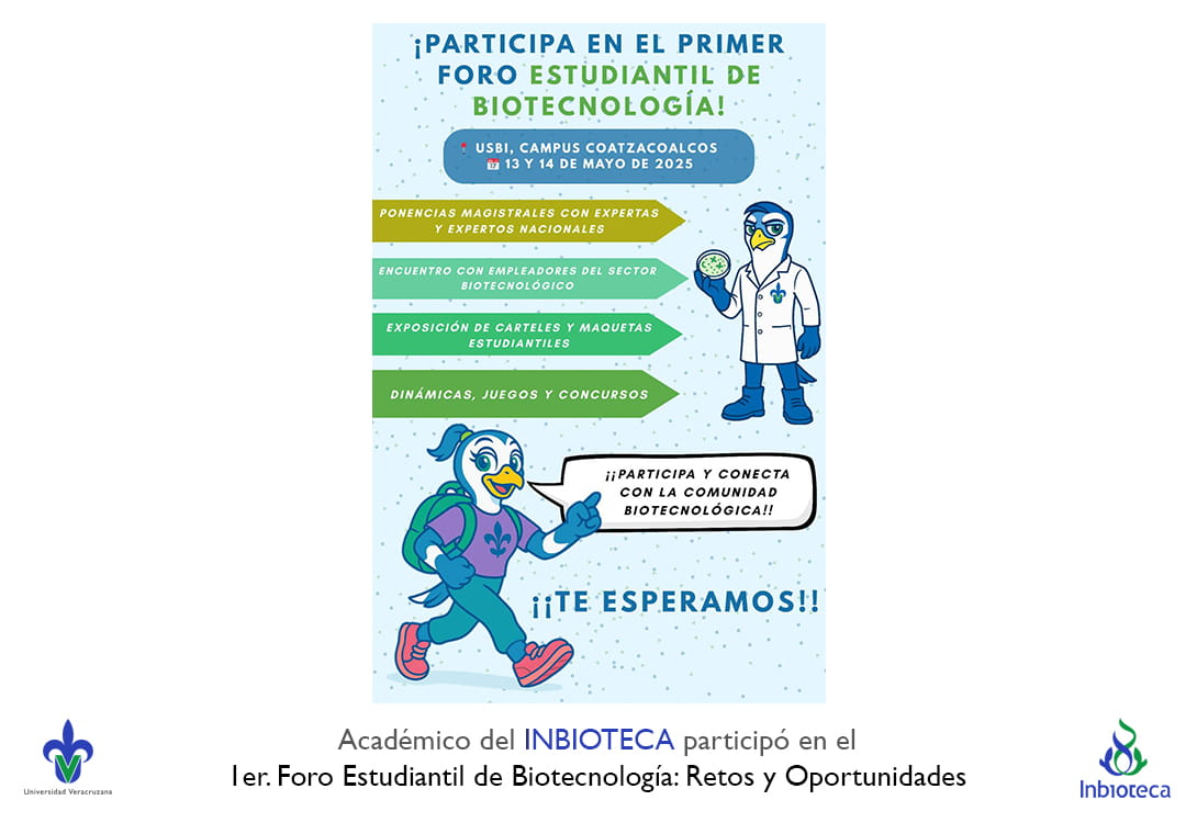 Mayo de 2025.- El Dr. Sergio Martínez Hernández Académico/Investigador del INBIOTECA (SNII II), participó en el 1er Foro Estudiantil de Biotecnología: Retos y Oportunidades, evento organizado por la Facultad de Ciencias Químicas de la región Coatzacoalcos-Minatitlán de la Universidad Veracruzana, realizado el 13 y 14 de mayo de 2025 de manera presencial en la Ciudad de Coatzacoalcos, Veracruz, México. El objetivo del foro tuvo como fin promover el aprendizaje colaborativo, permitiendo a los estudiantes de Ingeniería en Biotecnología fortalecer y generar relaciones con especialistas en el área de la biotecnología y consolidar sus intereses comunes.
