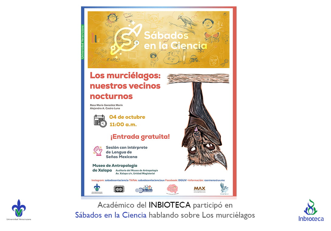 En una mañana llena de conocimiento, preguntas y respuestas, demostraciones y actividades lúdicas para chicos y grandes, los doctores impartieron la charla intitulada Los murciélagos: nuestros vecinos ocultos, que contó con el apoyo en la traducción a lenguaje de señas mexicana del colectivo Manos Florecer -LSM, para el público con capacidades diferentes. El taller consistió en un charla sobre la biología e importancia de estos interesantes mamíferos, los sitios donde habitan y cómo podemos convivir con estas fascinantes especies nocturnas. Al finalizar, se realizaron actividades lúdicas con el fin de promover las vocaciones científicas en el público infantil. Actualmente, el Dr. Castro Luna es invetigador en el SNII en el Nivel 2, cuenta con perfil PRODEP y es miembro del Cuerpo Académico: Ecología y Manejo de la Biodiversidad (UV-CA-173).