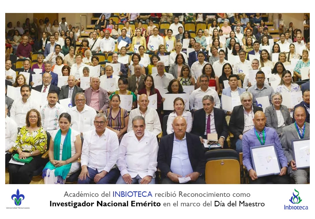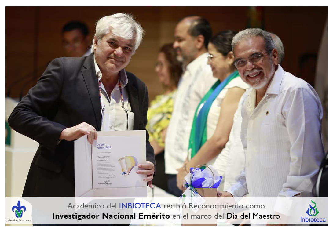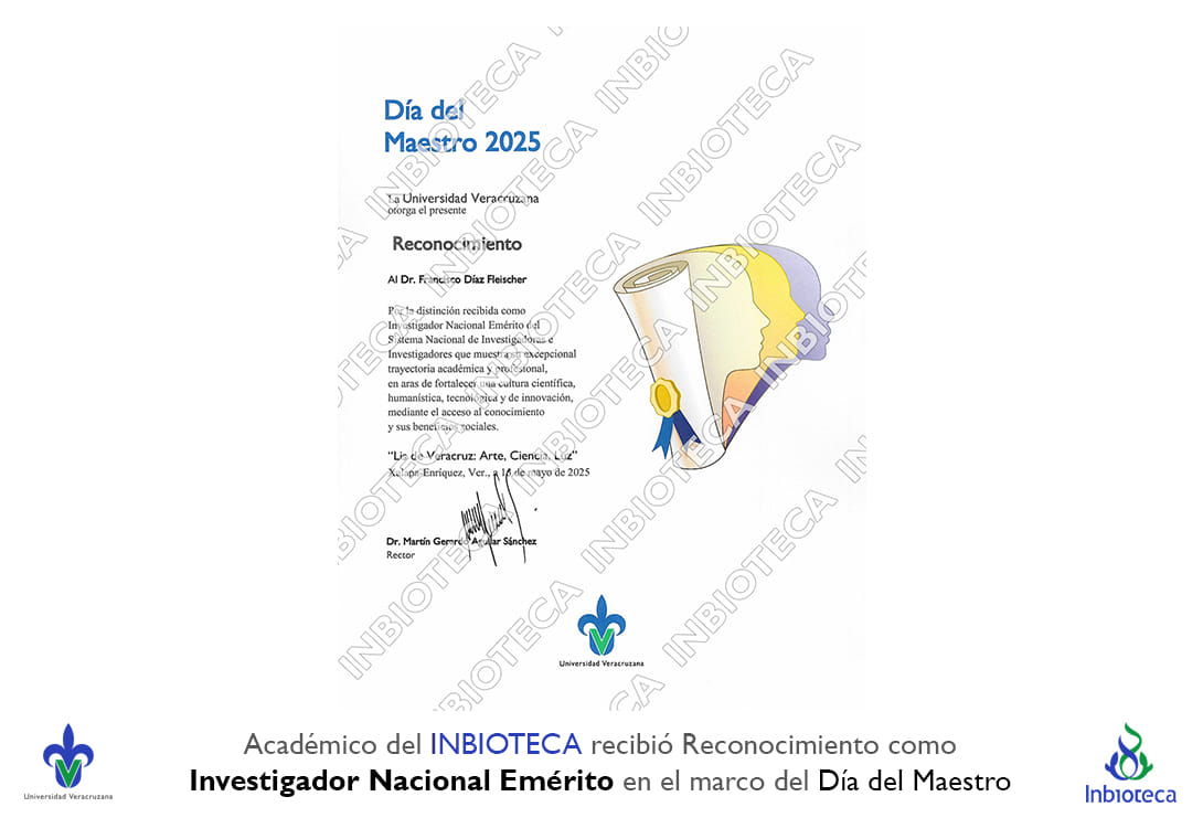 Mayo de 2025.- En el marco de la celebración del Día del Maestro en la Universidad Veracruzana, evento encabezado por el Rector Dr. Martín Gerardo Aguilar Sánchez, se entregaron reconocimientos al Desempeño Docente; agradecimientos a académicas y académicos jubilados; a quienes obtuvieron el Nivel Emérito en el Sistema Nacional de Investigadoras e Investigadores. En este contexto, la comunidad del INBIOTECA felicita al Dr. Francisco Díaz Fleischer académico/investigador adscrito a este Instituto, por haber recibido el reconocimiento Institucional por obtener la distinción de Investigador Nacional Emérito del Sistema Nacional de Investigadoras e Investigadores (SNII) de la Secretaría de Ciencia, Humanidades, Tecnología e Innovación (SECIHTI).