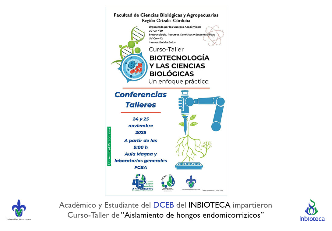 Noviembre de 2025.- El Dr. Antonio Andrade Torres (SNII 1 y Perfil PRODEP) Académico/Investigador del INBIOTECA y la estudiante del Doctorado en Ciencias (DCEB) Mtra. María Mabel de Jesús Alarcón (Gen 2025), impartieron el taller práctico Aislamiento de hongos endomicorrizicos en el marco del Curso-Taller Biotecnología y las Ciencias Biológicas: Un enfoque práctico, evento organizado por los Cuerpos Académicos UV-CA-489: Biotecnología, Recursos Genéticos y Sustentabilidad y por UV-CA-442: Innovación Mécanica de la Facultad de Ciencias Biológicas y Agropecuarias región Orizaba-Córdoba de la Universidad Veracruzana, celebrado el 24 y 25 de noviembre de 2025 en la FCBA de Peñuela, Mpio. de Amatlán de los Reyes, Veracruz.