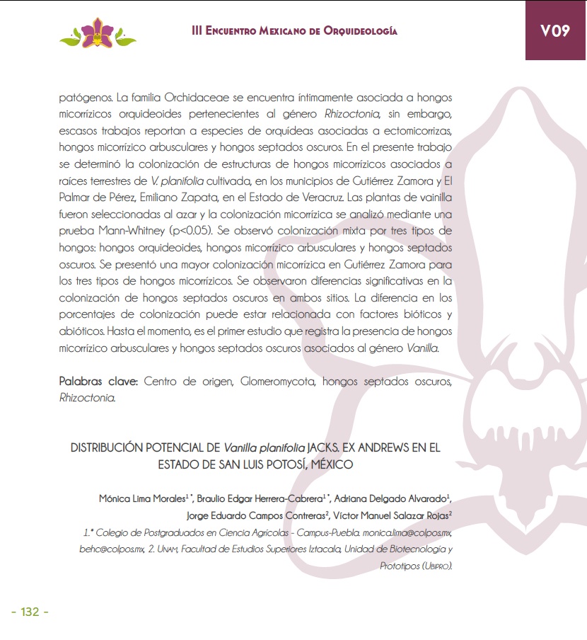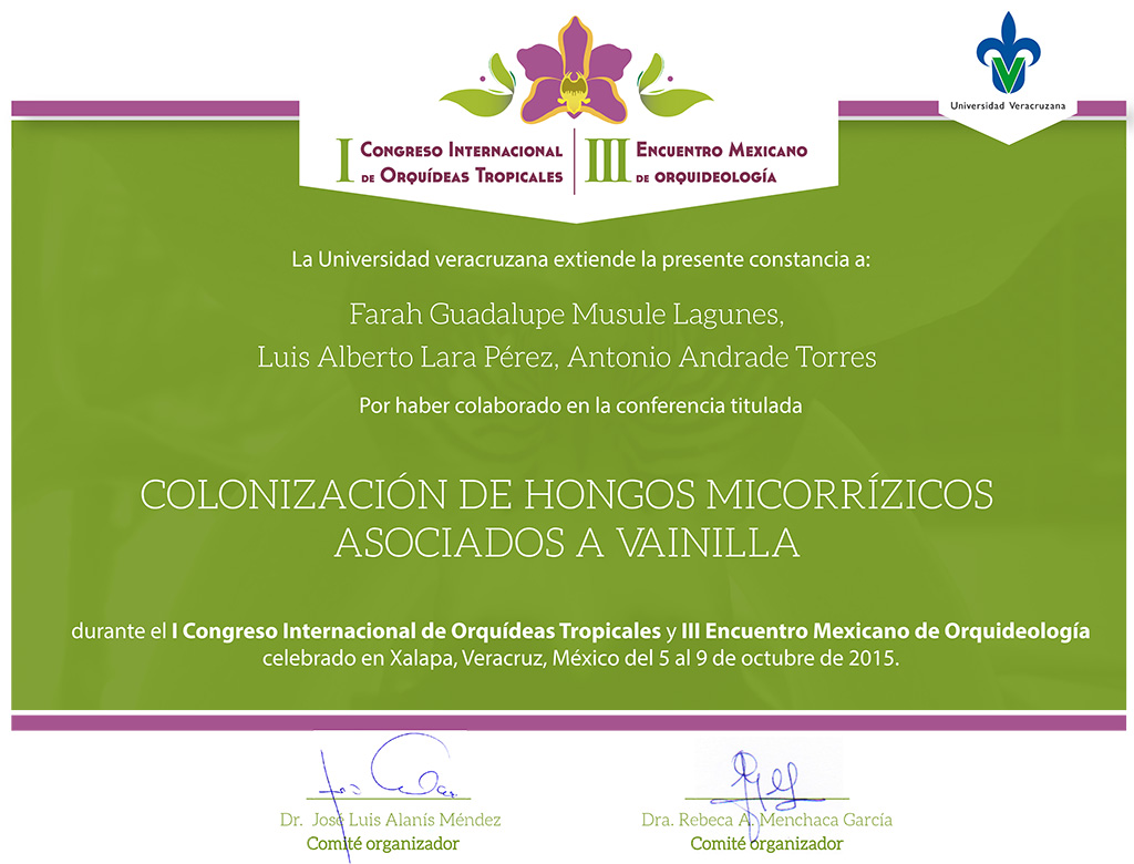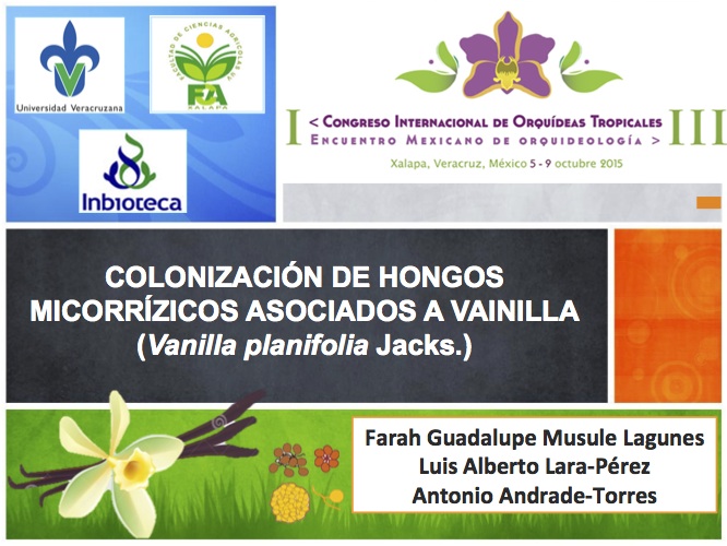 La Ing. Agr. Farah G. Musule Lagunes, quien desarrolló su tesis de licenciatura en INBIOTECA, fue la encargada de presentar una ponencia donde se incluyó parte de su trabajo de investigación de licenciatura, el cual realizó bajo la dirección del Dr. Antonio Andrade-Torres académico del INBIOTECA y responsable de la LGAC Biotecnología y Ecología de Organismos Simbióticos (CA 173, Ecología y manejo de la biodiversidad) y la asesoría del Dr. Luis Alberto Lara Pérez (egresado del DCEB del Inbioteca y actual Posdoctorante en INBIOTECA). Este equipo de trabajo conformaron los coautores de la conferencia presentada en la sección Conservación y Manejo de la Vainilla intitulada: "Colonización de hongos micorrízicos asociados a Vainilla".
