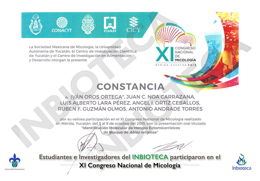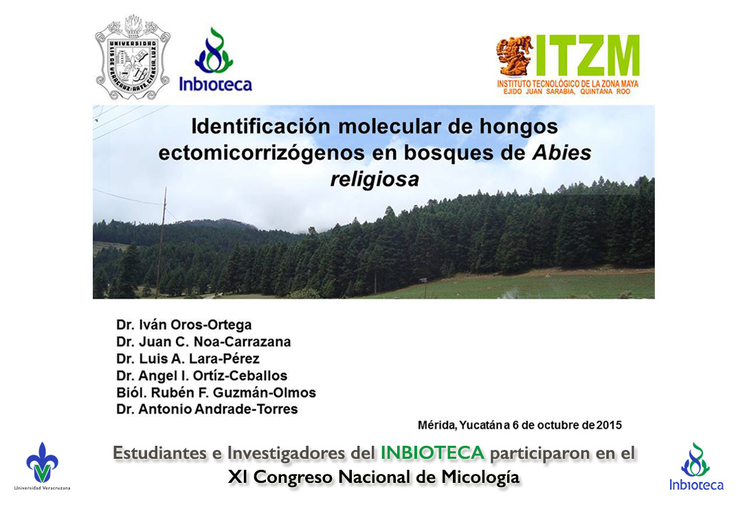 El Dr. Iván Oros Ortega egresado del DCEB, fue el encargado de presentar una ponencia donde se incluyó parte de su trabajo de investigación doctoral, el cual realizó bajo la dirección del Dr. Antonio Andrade-Torres y Dr. Juan Carlos Noa-Carrazana y la asesoría del Dr. Angel I. Ortiz-Ceballos (académicos del INBIOTECA). El trabajo presentado contó con la colaboración del Dr. Luis Alberto Lara Pérez (también egresado del DCEB) y el estudiante de Maestría Biol. Rubén Fernando Guzmán Olmos. Todo este equipo de trabajo conformaron los coautores de la conferencia presentada en la sección de Biología Molecular de Hongos, intitulada: Identificación molecular de hongos ectomicorrizógenos en bosques de Abies religiosa".