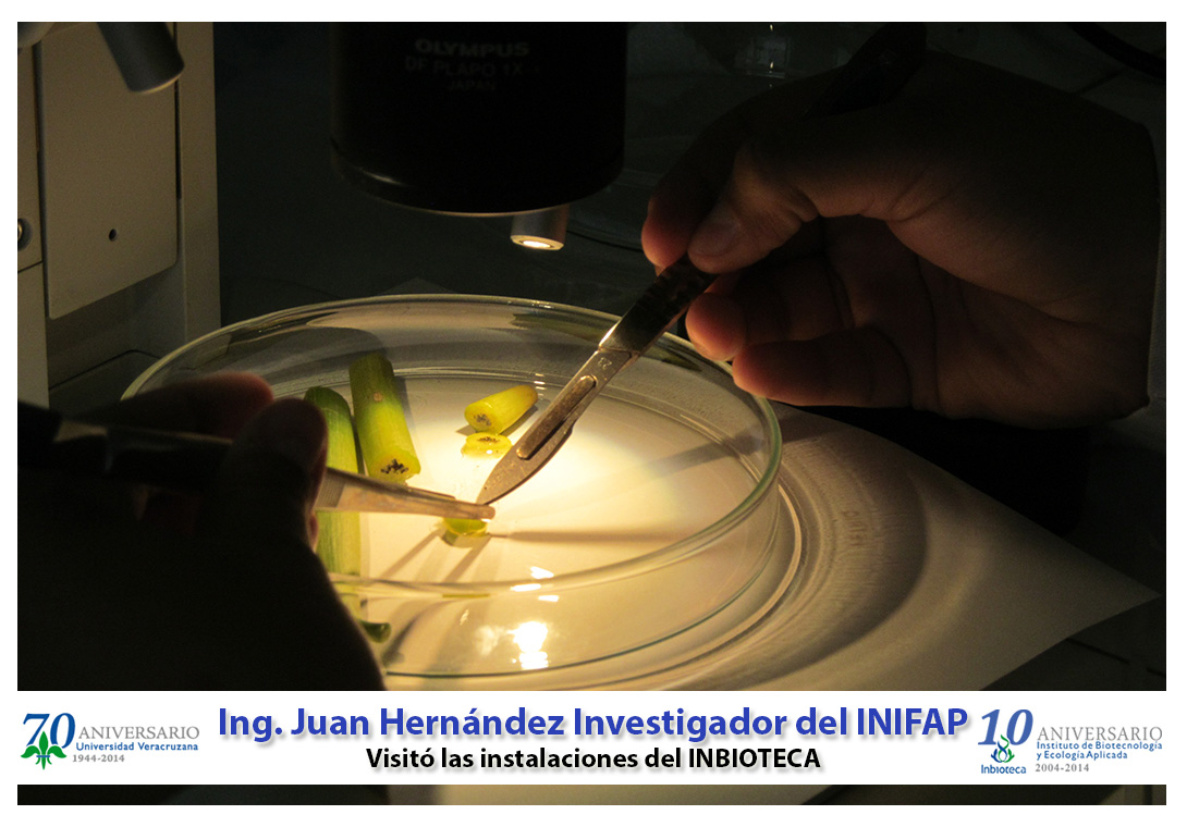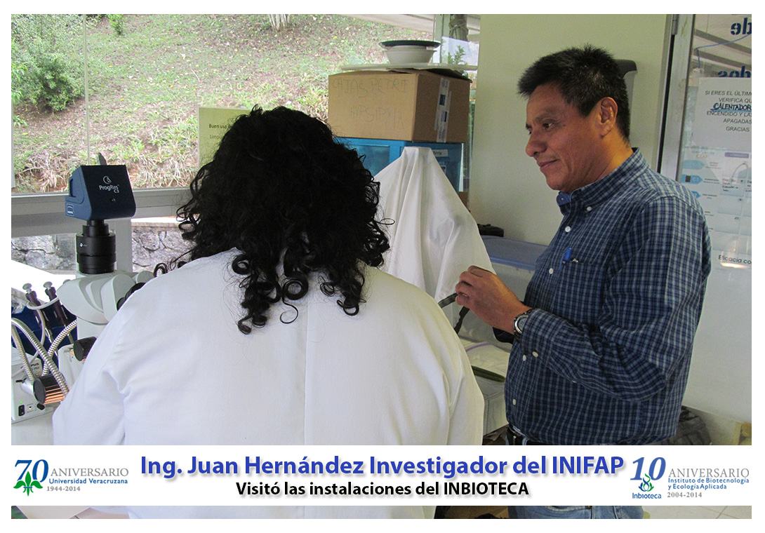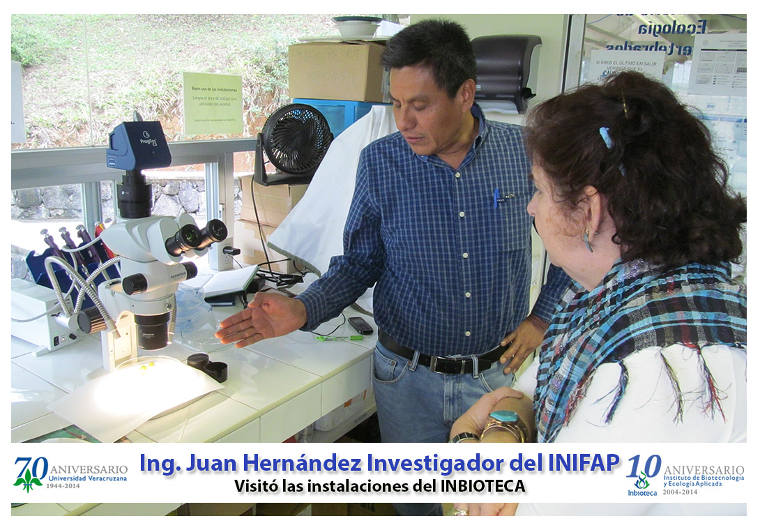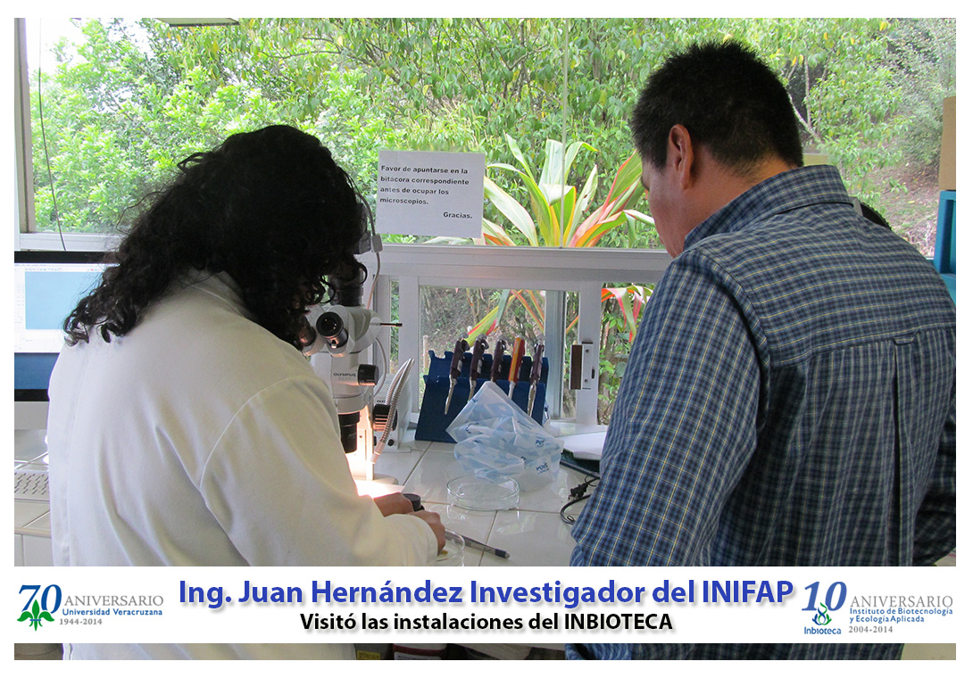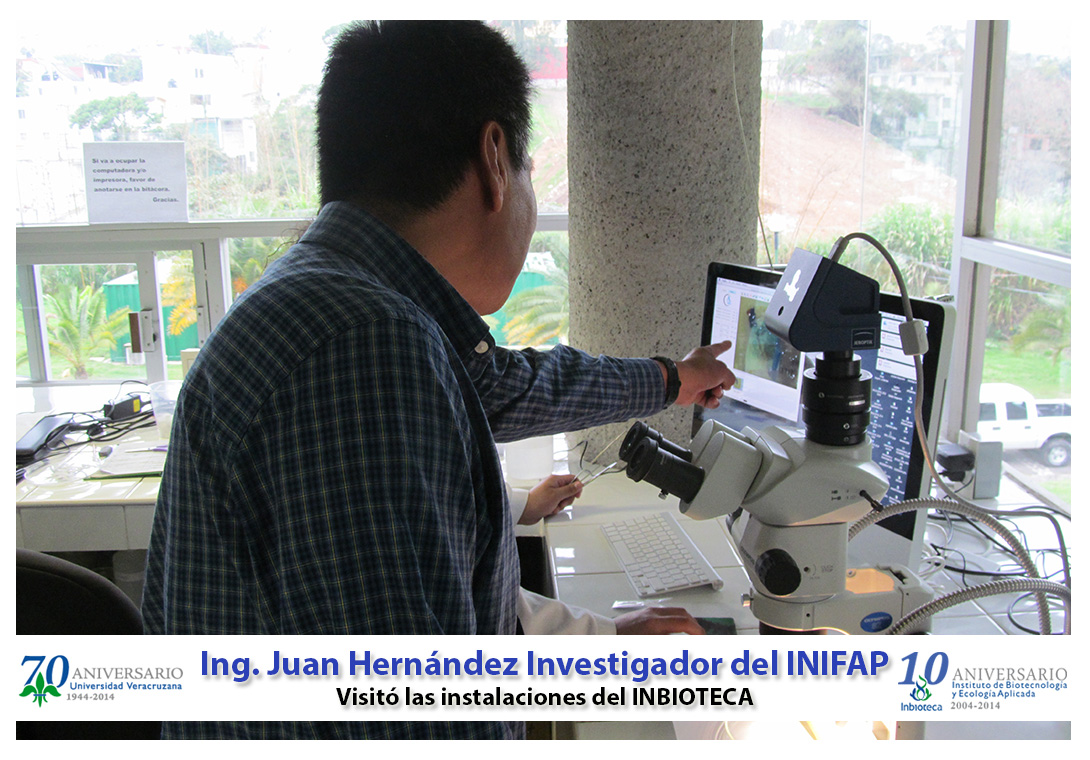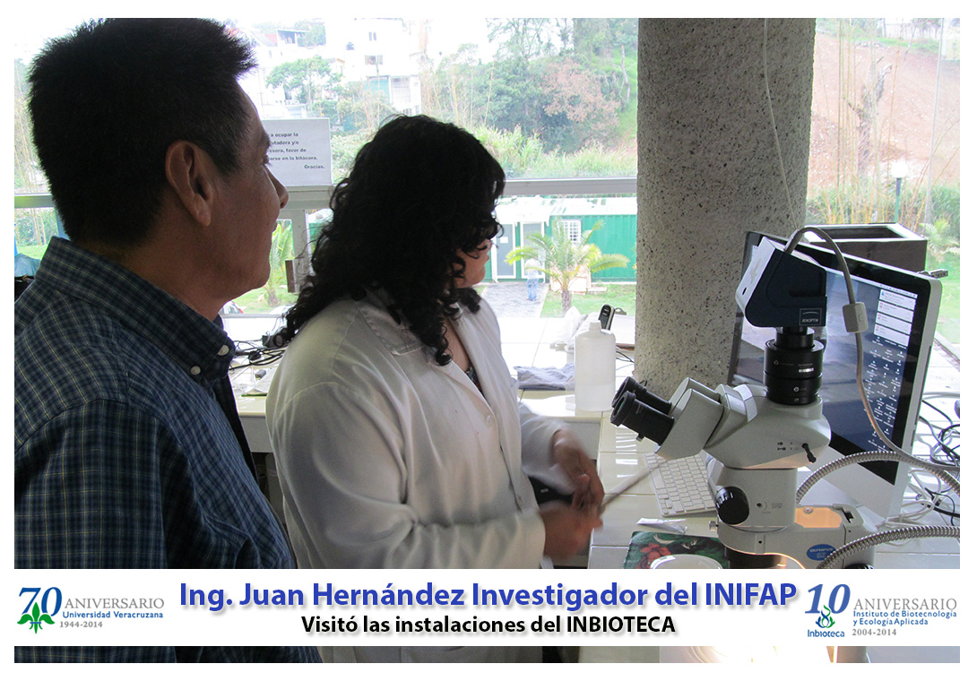 14 de marzo 2014.- Se recibió la visita del Ing. Juan Hernández Hernández, investigador del INIFAP, con sede en el Campo Experimental Ixtacuaco para realizar algunas observaciones microscópicas de frutos de V. planifolia. Dicho investigador al igual que investigadores del INBIOTECA forman parte del Macroproyecto de investigación, desarrollo e innovación tecnológica denominado: "Estrategia de Investigación aplicada para el fortalecimiento, innovación y competitividad de la producción de vainilla en México" que coordina el Dr. Braulio Edgar Herrera Cabrera, Profesor Investigador Titular, adscrito al Colegio de Postgraduados-Campus Puebla.