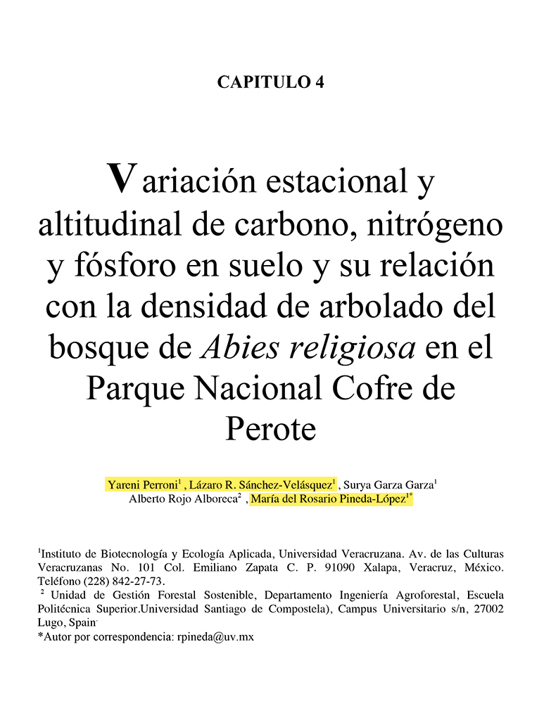 Yareni Perroni, Lázaro R. Sánchez-Velásquez, Surya Garza Garza, Alberto Rojo Alboreca, María del Rosario Pineda-López (2015). Variación estacional y altitudinal de carbono, nitrógeno y fósforo en suelo y su relación con la densidad de arbolado del bosque de Abies religiosa en el Parque Nacional Cofre de Perote Pp. 61-80. ISBN: 978-3659071850 |