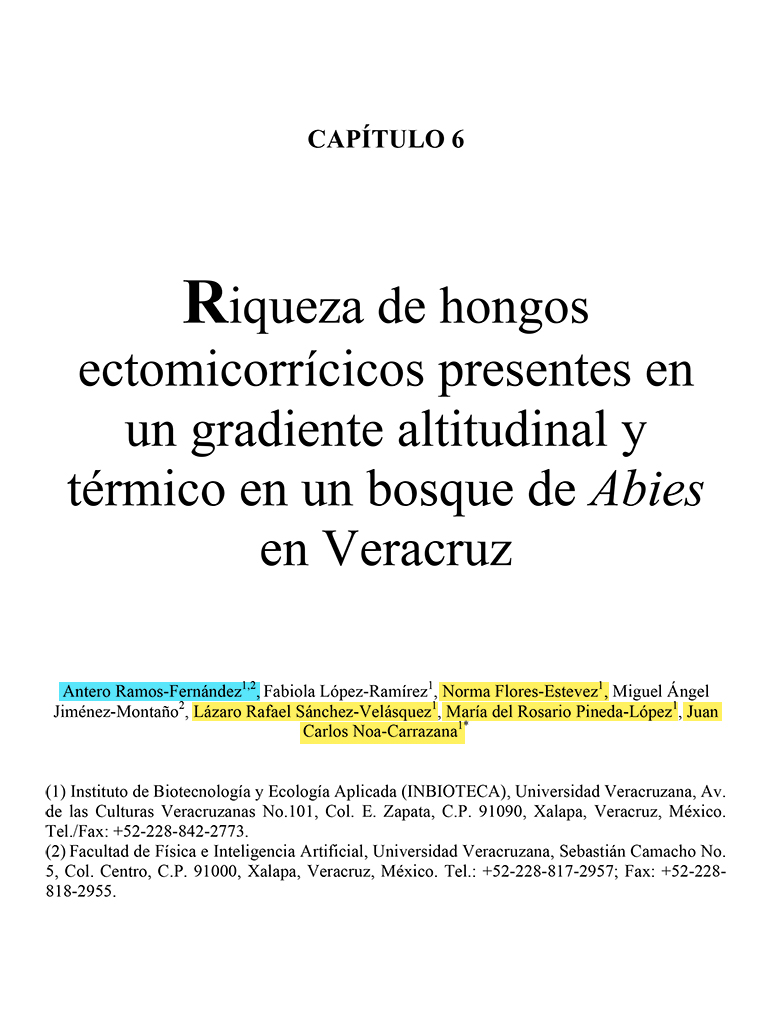 Antero Ramos-Fernández, Fabiola López-Ramírez, Norma Flores-Estevez, Miguel Ángel Jiménez-Montaño, Lázaro Rafael Sánchez-Velásquez, María del Rosario Pineda-López, Juan Carlos Noa-Carrazana (2015). Riqueza de hongos ectomicorrícicos presentes en un gradiente altitudinal y térmico en un bosque de Abies en Veracruz Pp. 112-135. ISBN: 978-3659071850 |