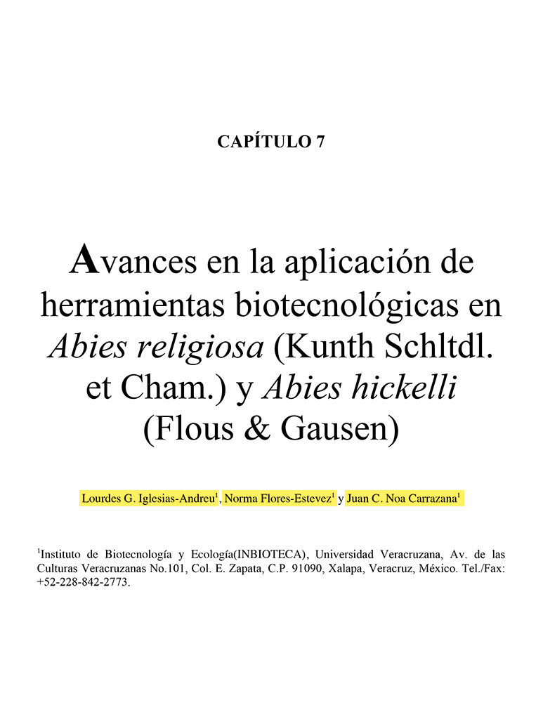 Lourdes G. Iglesias-Andreu, Norma Flores-Estevez y Juan C. Noa Carrazana (2015). Avances en la aplicación de herramientas biotecnológicas en Abies religiosa (Kunth Schltdl. et Cham.) y Abies hickelli (Flous & Gausen) Pp. 137-154. ISBN: 978-3659071850 |