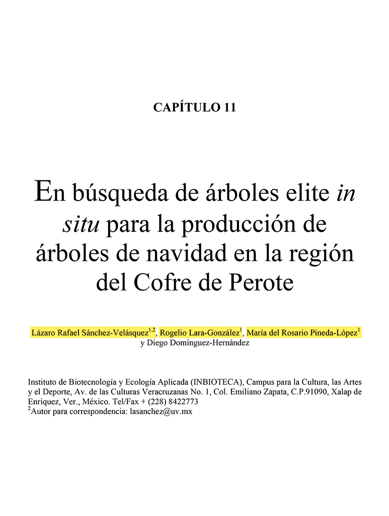Lázaro Rafael Sánchez-Velásquez, Rogelio Lara-González, María del Rosario Pineda-López y Diego Domínguez-Hernández (2015). En búsqueda de árboles elite in situ para la producción de árboles de navidad en la región del Cofre de Perote Pp. 206-216. ISBN: 978-3659071850 |