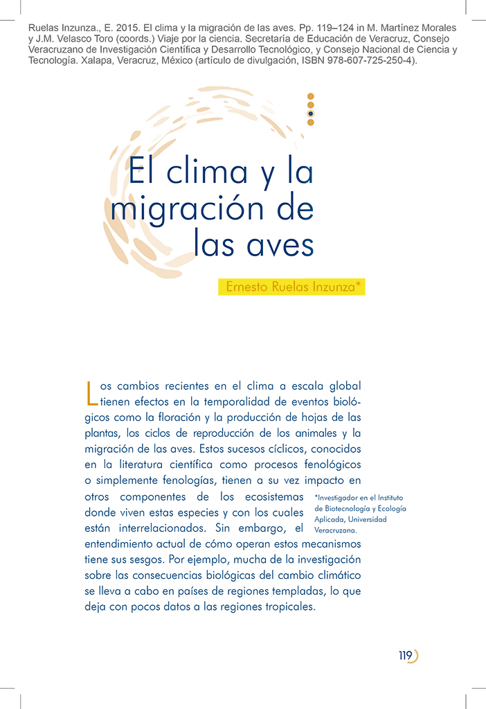 Ernesto Ruelas-Inzunza (2015). El clima y la migración de las aves Pp. 119-124. ISBN: 978-607-725-250-4 |