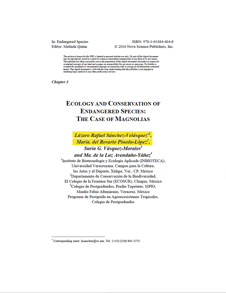 Lázaro Rafael Sánchez-Velásquez, María. del Rosario Pineda-López, Suria G. Vásquez-Morale and Ma. de la Luz Avendaño-Yáñez. (2016). Ecology and conservation of endangered species: the case of magnolias. Pp. 63-84-124. ISBN: 978-1-63484-404-8 |