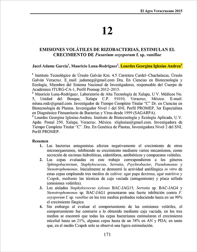 Jacel Adame García, Mauricio Luna-Rodríguez, Lourdes Georgina Iglesias Andreu (2015). Emisiones volátiles de rizobacterias, estimulan el crecimiento de Fusarium oxysporum f. sp. vanillae Pp. 171-183. ISBN: 978-607-96939-2-3 |