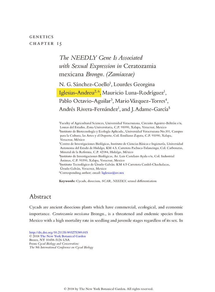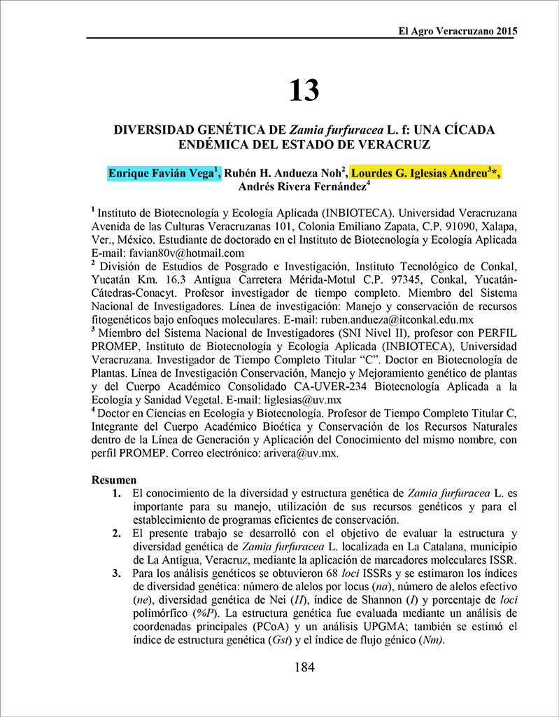 Enrique Favián Vega, Rubén H. Andueza Noh, Lourdes G. Iglesias Andreu, Andrés Rivera Fernández (2015). Diversidad genética de Zamia furfuracea L. f: una cícada endémica del Estado de Veracruz Pp. 184-199. ISBN: 978-607-96939-2-3 |