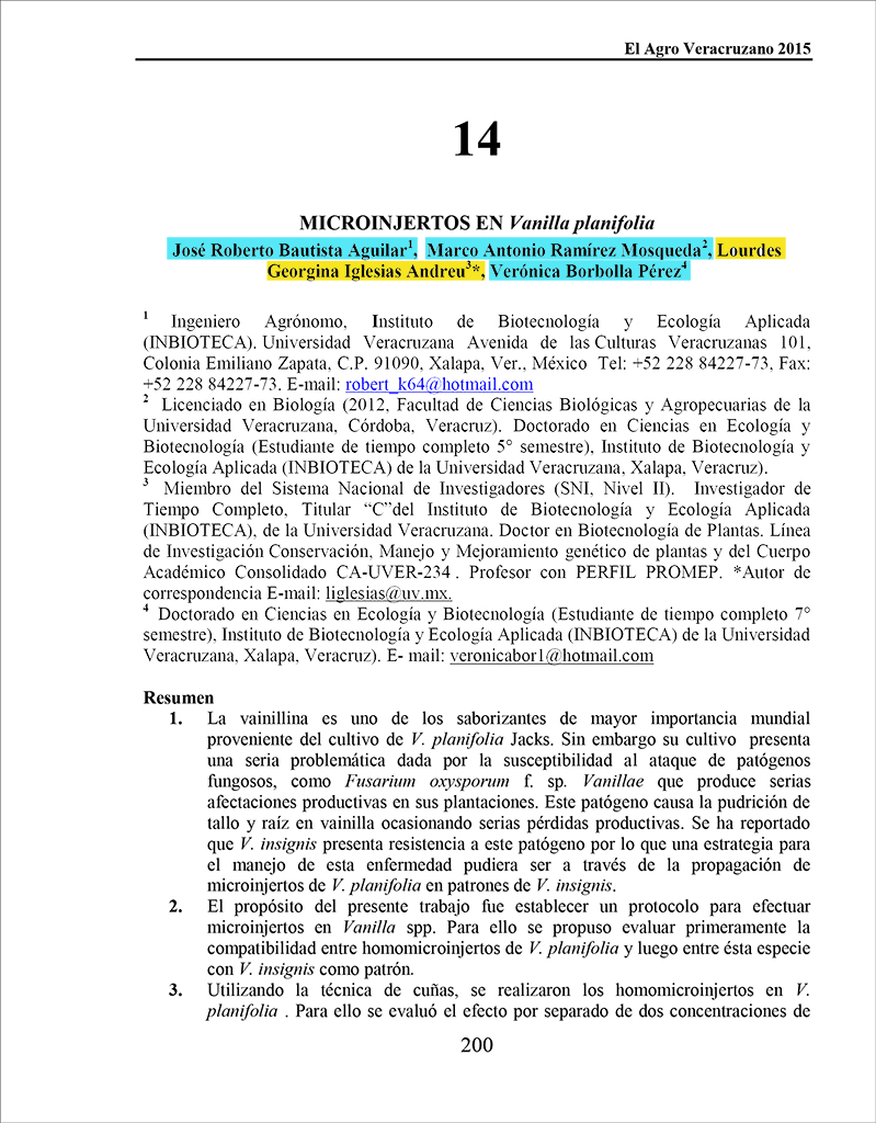 José Roberto Bautista Aguilar, Marco Antonio Ramírez Mosqueda, Lourdes Georgina Iglesias Andreu, Verónica Borbolla Pérez (2015). Microinjertos en Vanilla planifolia Pp. 200-210. ISBN: 978-607-96939-2-3 |