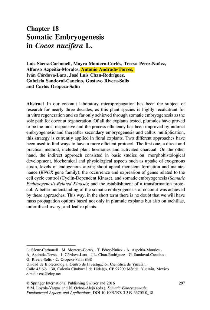 Sáenz, L., Montero-Córtez M; Pérez-Nuñez T., Azpeitia A., Andrade-Torres A., Córdova I., Chan J.L., and Oropeza C. (2013). Coconut (Cocos nucifera L.) Somatic Embryogenesis and Related Gene Expression. Pp. 141-150. ISBN-10: 8184872283. ISBN-13: 978-8184872286. |
