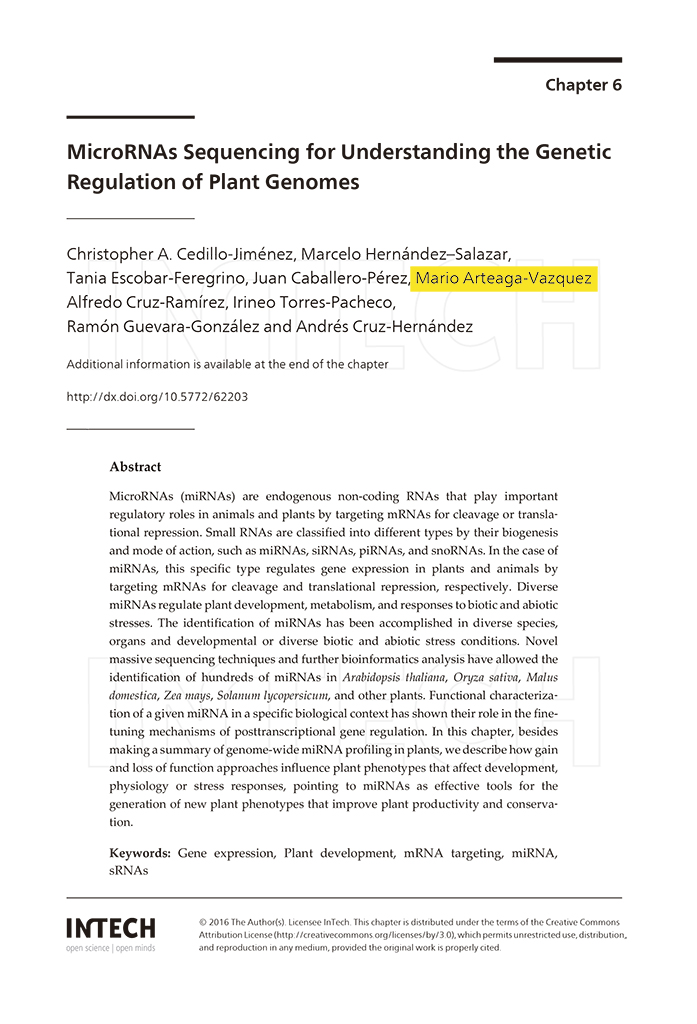 Christopher A. Cedillo-Jiménez, Marcelo Hernández–Salazar, Tania Escobar-Feregrino, Juan Caballero-Pérez, Mario Arteaga-Vázquez, Alfredo Cruz-Ramírez, Irineo Torres-Pacheco, Ramón Guevara-González and Andrés Cruz-Hernández (2016). MicroRNAs Sequencing for Understanding the Genetic Regulation of Plant Genomes Pp. 103-118. ISBN 978-953-51-2456-6, Print ISBN 978-953-51-2455-9 |