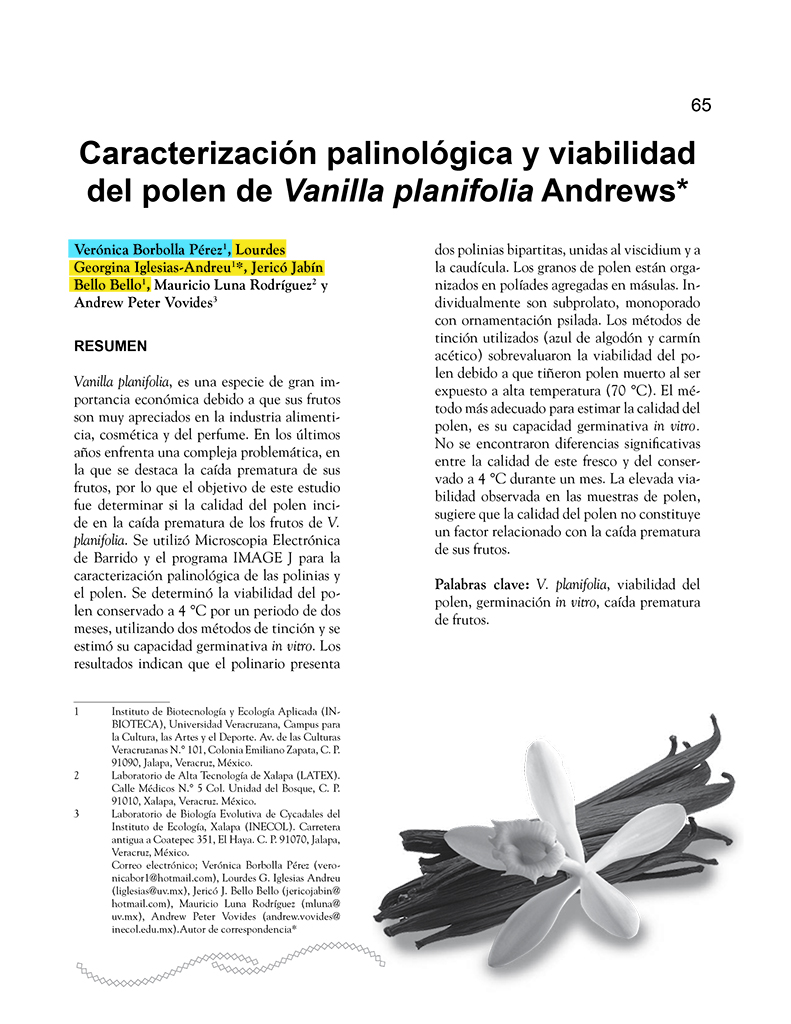 Verónica Borbolla Pérez, Lourdes Georgina Iglesias-Andreu, Jericó Jabín Bello Bello, Mauricio Luna Rodríguez y Andrew Peter Vovides (2016). Caracterización palinológica y viabilidad del polen de Vanilla planifolia Andrews Pp. 65-80. ISBN 978-9968-9996-5-6 |