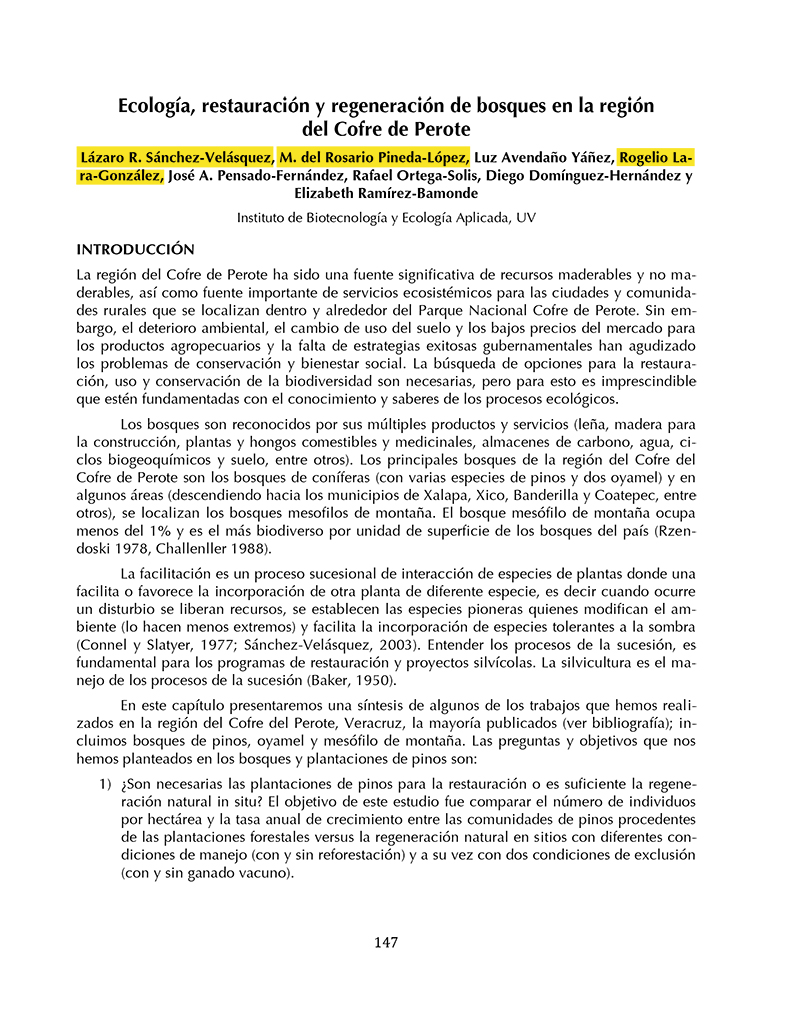 Sánchez-Velásquez, L.R. y Ma. del R. Pineda-López. (2008) Vacas y bosques de la Sierra de Manantlán: estrategias de restauración y manejo. Chapter: 9. Pp. |